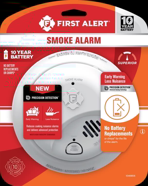 10 Year Battery Ionization Smoke Alarm; 10-Year sealed battery eliminates battery replacements and low battery chirps for the life of the alarm.; Complies with new industry standards to reduce cooking nuisance alarms and provides early warning in the event of a home fire emergency.; Test/silence button for efficient testing and end-of-life warning lets you know when it's time to replace the alarm.; This alarm offers superior protection with a precision detection advanced technology sensor, easy installation and 10-year battery.