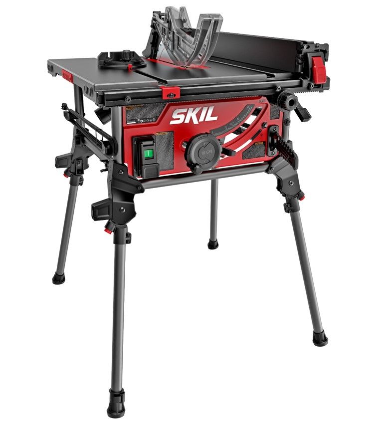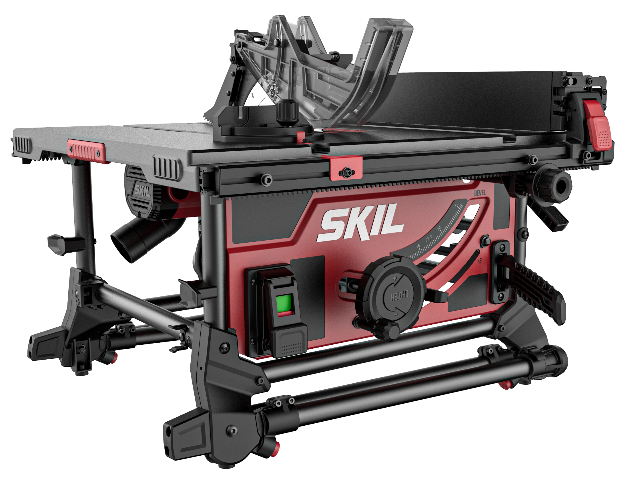 The SKIL Jobsite Table Saw has a 25-1/2" (64.77cm) Rip Capacity and is equipped with a 15-Amp motor, integrated foldable legs, rack & pinion fence rails, and a dust port elbow to keep your jobsite clean. The 15-Amp motor quickly rips through hardwoods with ease, while the rack & pinion fence rails make fence adjustments fast, smooth, and accurate. With its 0-45° bevel capacity, the quick release lever allows for cuts between two positive stops at 0 and 45 degrees, and its 4x4 cutting capacity allows for swift 90-degree cutting. The integrated foldable legs seamlessly form into a folding stand to provide portability and convenience, while the dust port elbow systematically redirects dust to a container for easy cleanup. The parallel blade alignment allows for ease of blade adjustment along the rip fence and miter slot, for precise accurate cuts. This table saw features a safety anti-restart switch in case of power outages. This large coated cast aluminum tabletop saw comes equipped with a 10" 24-tooth carbide blade. When using a dado insert, this table saw requires an 8 in. dado blade set.Specifications