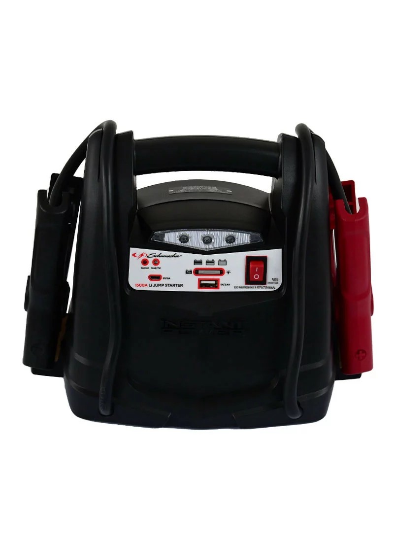 This all-in-one device ensures users are prepared for their next roadside emergency. The Schumacher SL1519 Portable Power Station and 1500A Lithium Jump Starter is a versatile tool that smart drivers take with them on the road. It’s also ideal for camping and tailgating. The SL1519 is a portable power station, jump starter, air compressor, and work light all in one lightweight and compact unit. It features a fast charging 2.4A USB port for charging all your USB devices, including smartphones and tablets. The 1500A jump starter is powerful enough to start up to 10.0L gas and 8.0L diesel engines, providing peace of mind. The built-in 150-PSI air compressor easily adds air to low bike or car tires and includes an array of nozzles.Specifications