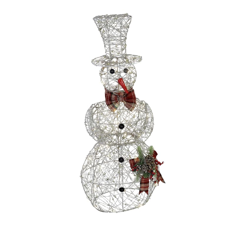 Elevate your indoor/outdoor display with the Alpine Corporation Gold Wire Snowman with LED Lights! The snowman, accented with a bow-tie and festive greenery, features 10 Warm White LED Lights with a convenient timer that turns off after 6 hours. Decorate entryways, patios and more. It is durable, uses 3 AA batteries (not included), has an on/off/timer switch and 4 ground stakes for stability. It measures 9"L x 8"W x 18"H and includes a one-year manufacturer's warranty from date of purchase.Specifications