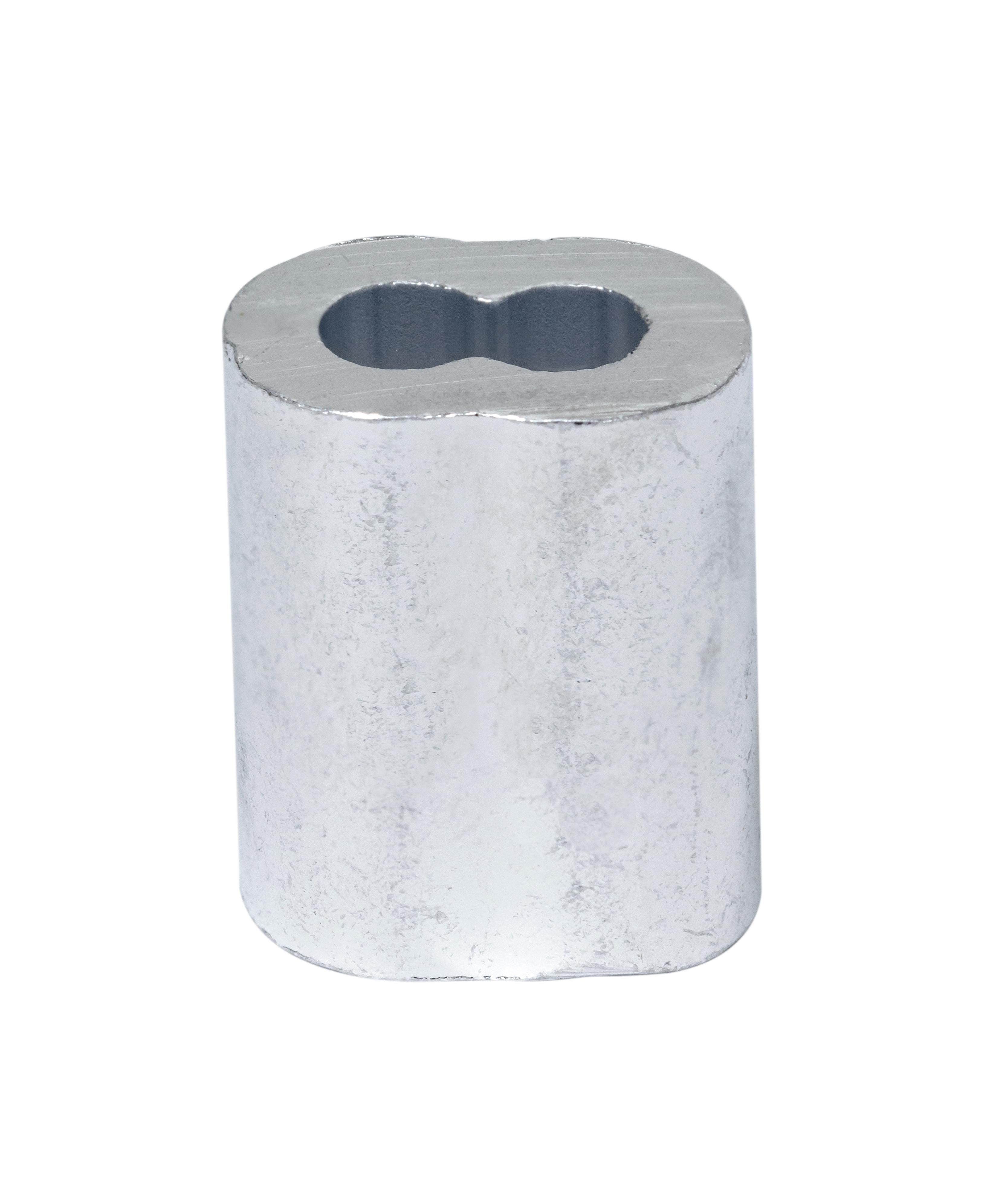 Aluminum sleeves are designed for forming an eye or loop on wire rope. Aluminum construction makes them soft enough to be crimped, but still provides ample strength and corrosion resistance. When properly applied, aluminum sleeves have the same breaking strength as the cable they are crimped onto. If used on PVC-coated cable, remove the coating from the assembly area before swaging. Sleeves can be fastened using the appropriate sized crimping and swaging tool. Designed for use on cable of the same size diameter.Specifications
