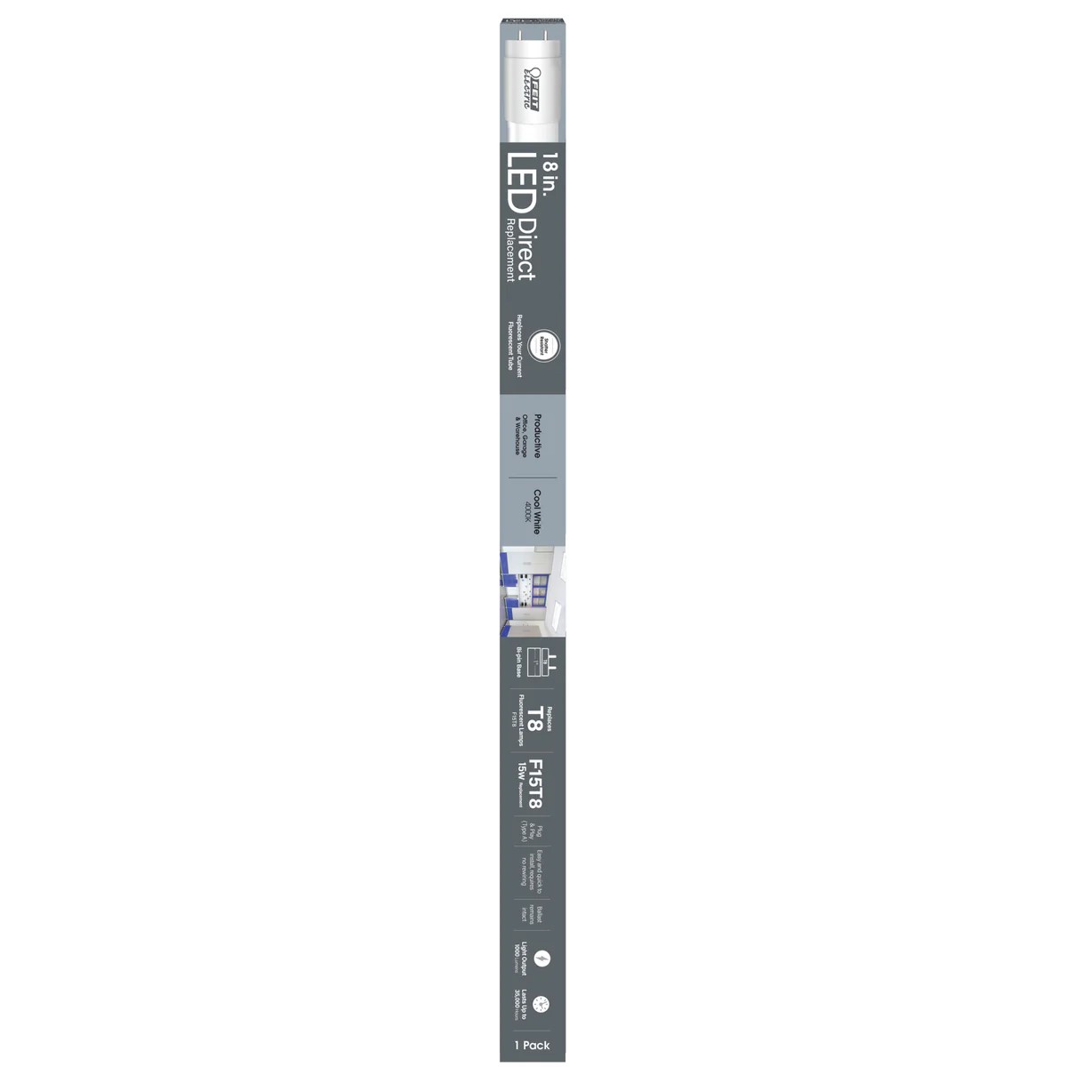 Feit Electric’s 12-watt Direct Replacement (Type A) Non-Dimmable Linear LED Tubes replace 15-watt F15T8 or T8 fluorescent and LED tubes. They work with most existing electronic ballasts for quick and easy plug-and-play installation, with no rewiring necessary. Each Linear LED light produces 1000 lumens, while using less energy than fluorescents. These versatile 4000K Cool White lights provide clean, mid-range light for both living and workspaces. Use them for multi-purpose lighting or task lighting wherever it is important to feel refreshed and ready to get things done. An ideal choice for most fluorescent linear tube replacement applications, use them in offices, garages, workspaces, warehouses, and more. T818/840/LED lights turn on instantly, offering flicker-free full illumination with no warmup time compared to fluorescent tubes. They are mercury-free, with a shatter-resistant coating for safe and easy disposal. Each high-quality bulb offers accurate color rendering, for more vibrant, true-to-life colors. Lower heat emission extends the life of the tube and ends do not turn black or burn with age. Enjoy lower maintenance costs compared to traditional fluorescent linear lights. The estimated energy cost is only $1.45 per year. Switch to Type A LED linear lights for your space and get up to 35,000 hours of superior light. That's 31.9 years based on 3 hours of daily use.Specifications