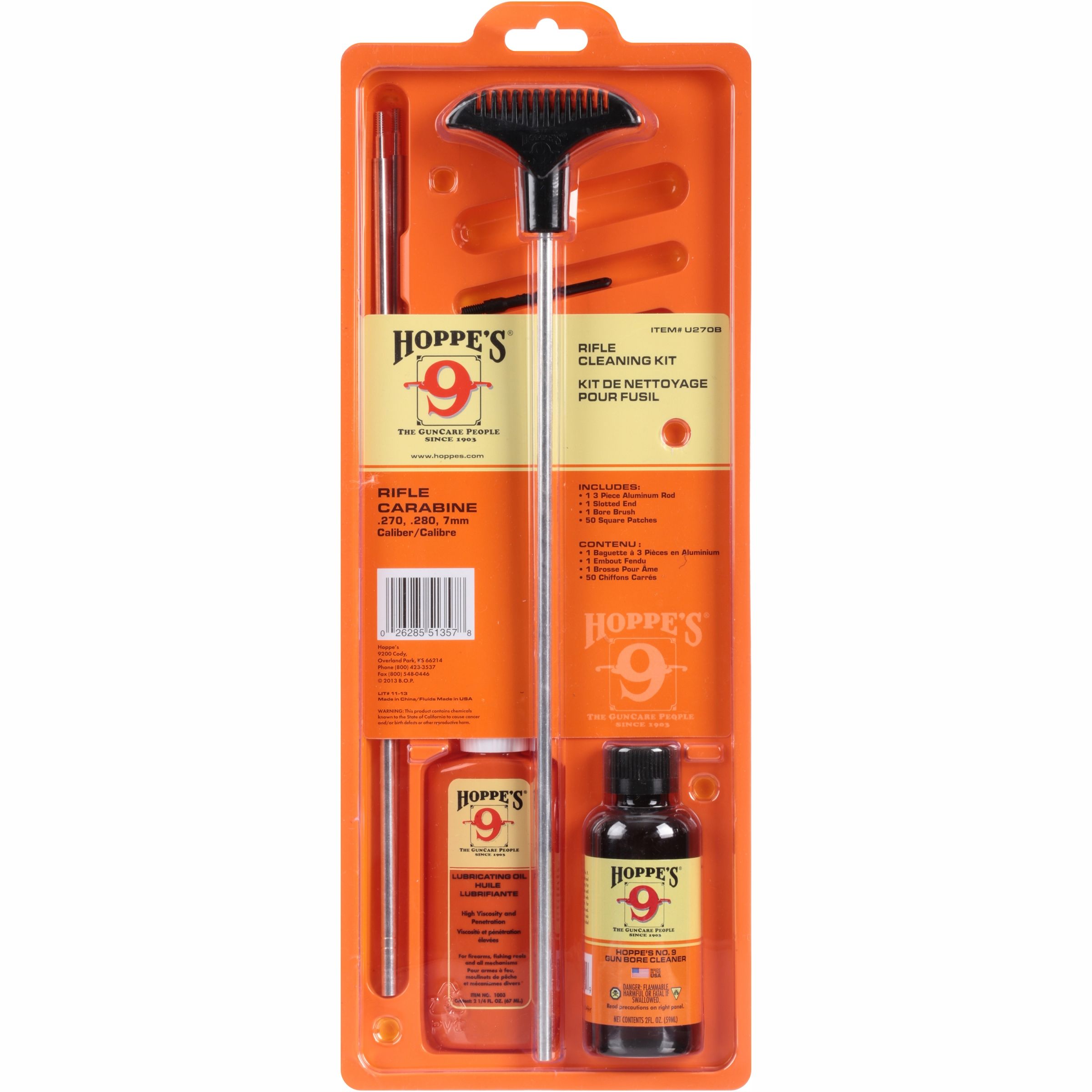 Hoppe's Rifle Cleaning Kit includes No. 9 solvent, No. 9 lubricating oil, and an aluminum rod with a knob, slotted ends, and brush.