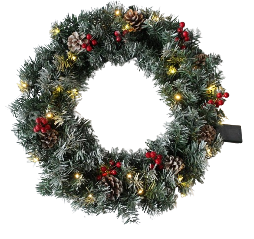140 SPRAYED WHITE TIPS; 22" PRELIT FROSTED DECORATED WREATH; 7PC RED BERRIES & 7PC PINE CONES; B/O 30 WARM WHITE LEDS; EASY SET UP AND TAKE DOWN