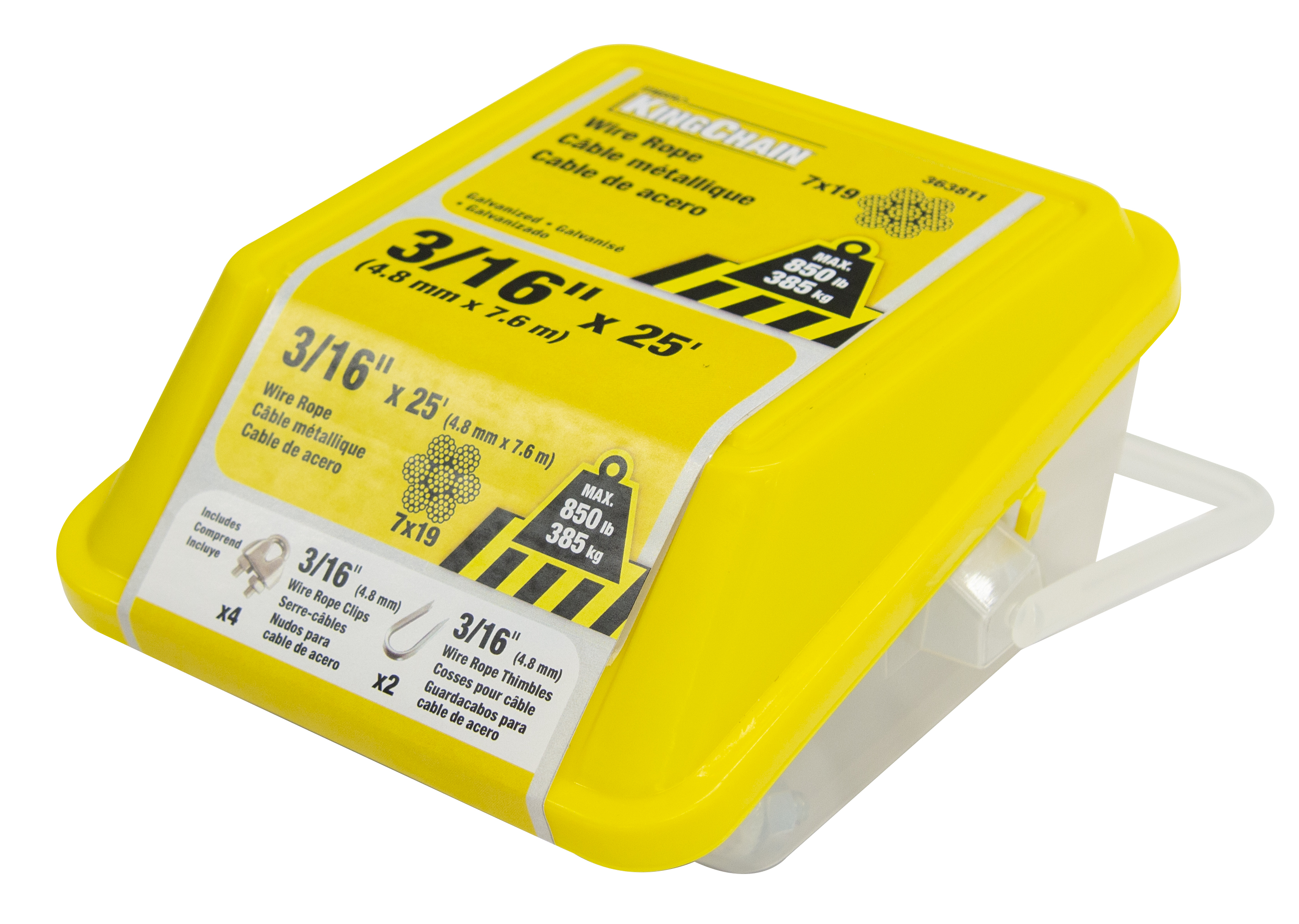 7x19 construction consists of 19 individual wires spiraled around a center wire to form a strand; Galvanized finish provides good corrosion and rust resistance; Includes 2 - 3/16 in wire rope thimbles; Includes 4 - 3/16 in wire rope clips; Safe work load of 850 lbs; This construction provides superior strength, flexibility and abrasion resistance compared to 7x7 cable; Use for garage door cables, winch lines, guy wires for flag poles and much more