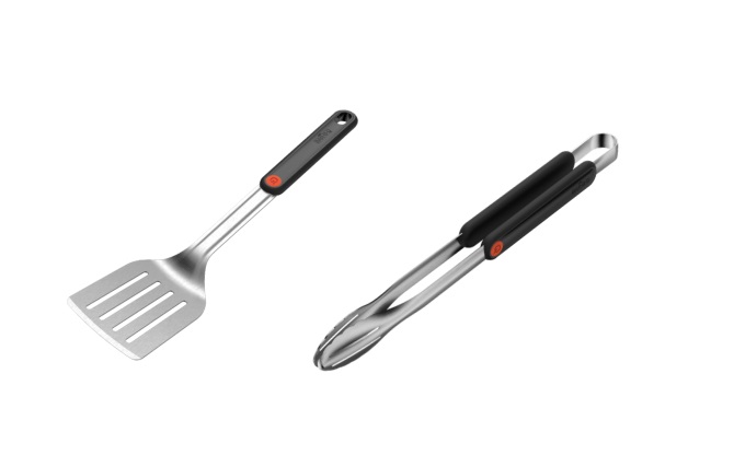 2 Piece Tool Set; Easy cleaning and usage: all barbeque accessories are easily cleaned with warm soapy water or dishwasher, also, coming with perfect heft, each essential of the BBQ set can behave well in your grilling, which will take your grilling experience to a whole new levels; Includes Spatula & Tongs. Unique " Q Branded " Plastic Handle. Non-Slip Professionally Balanced. Stainless Steel Construction