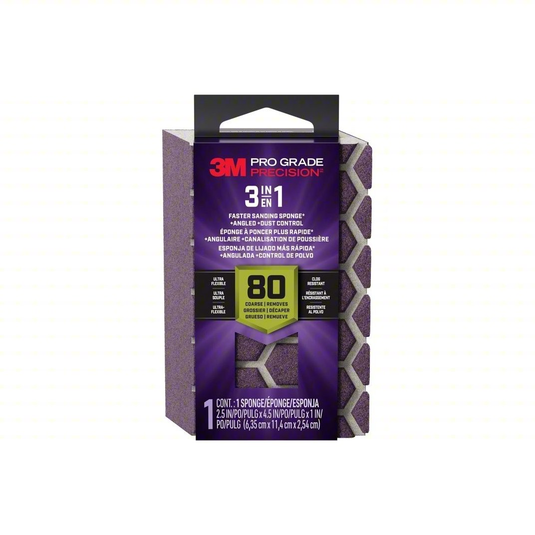 Keep your surface clean as you hand sand with the 3M Pro Grade Precision 3-in-1 Sanding Sponge. Featuring innovative channels on one side and a flat surface on the other, this three in one sanding sponge is great for detail work and flat sanding. Made with premium minerals and ultra durable foam, this sanding sponge lasts from one job to the next and lets you easily control the direction you're sanding. An innovative coating helps reduce clogging, and you can rinse the sponge and reuse it again and again. Tell extra dust to take a hike and reach for the multitasking power of the 3M Pro Grade Precision 3-in-1 Sanding Sponge.Specifications
