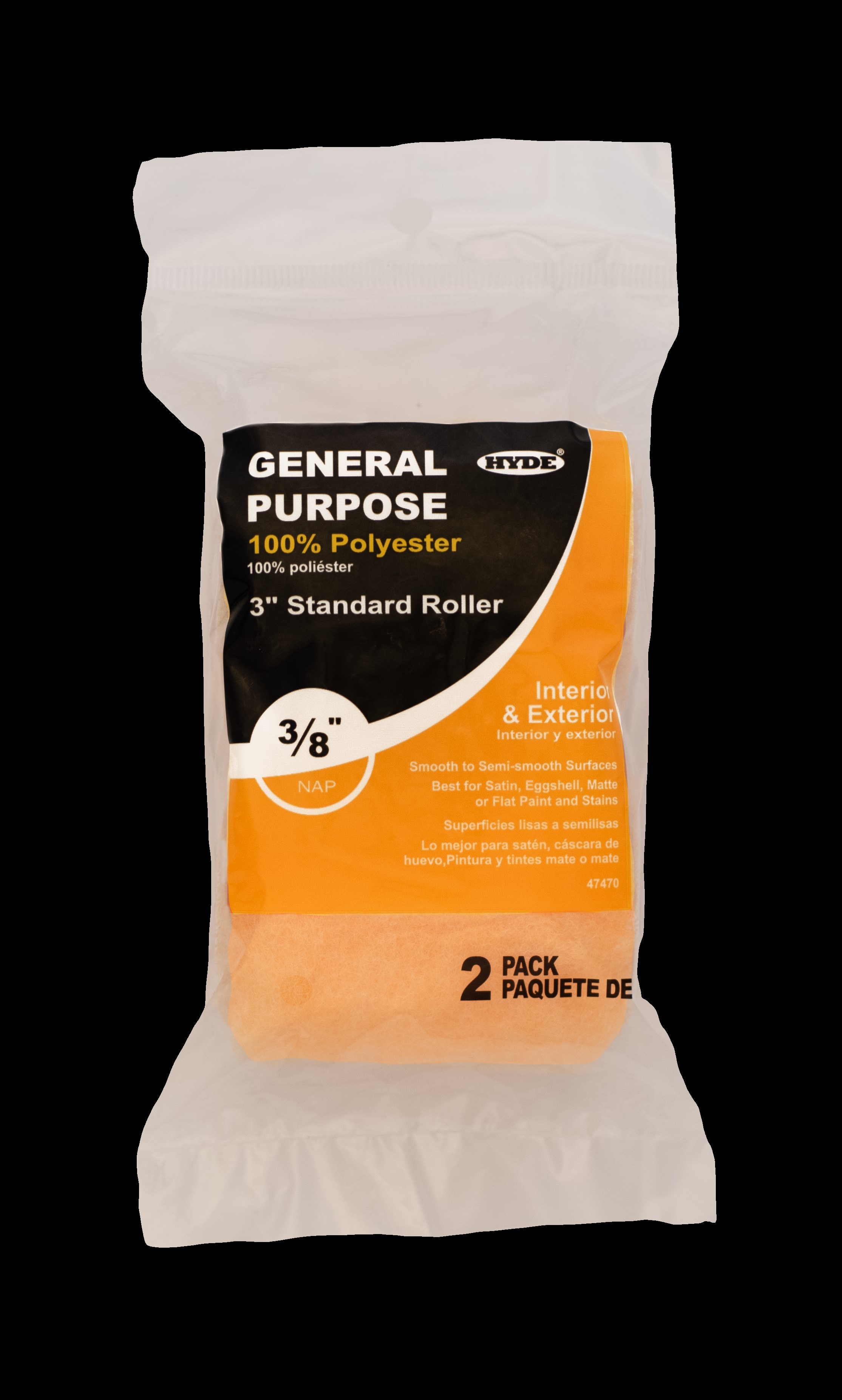 Hyde General Purpose roller covers feature high-density polyester material for more paint coverage. Best used with low to medium sheen paints and stains. The 2-Pack is designd to fit all 3" standard cage frames.Specifications
