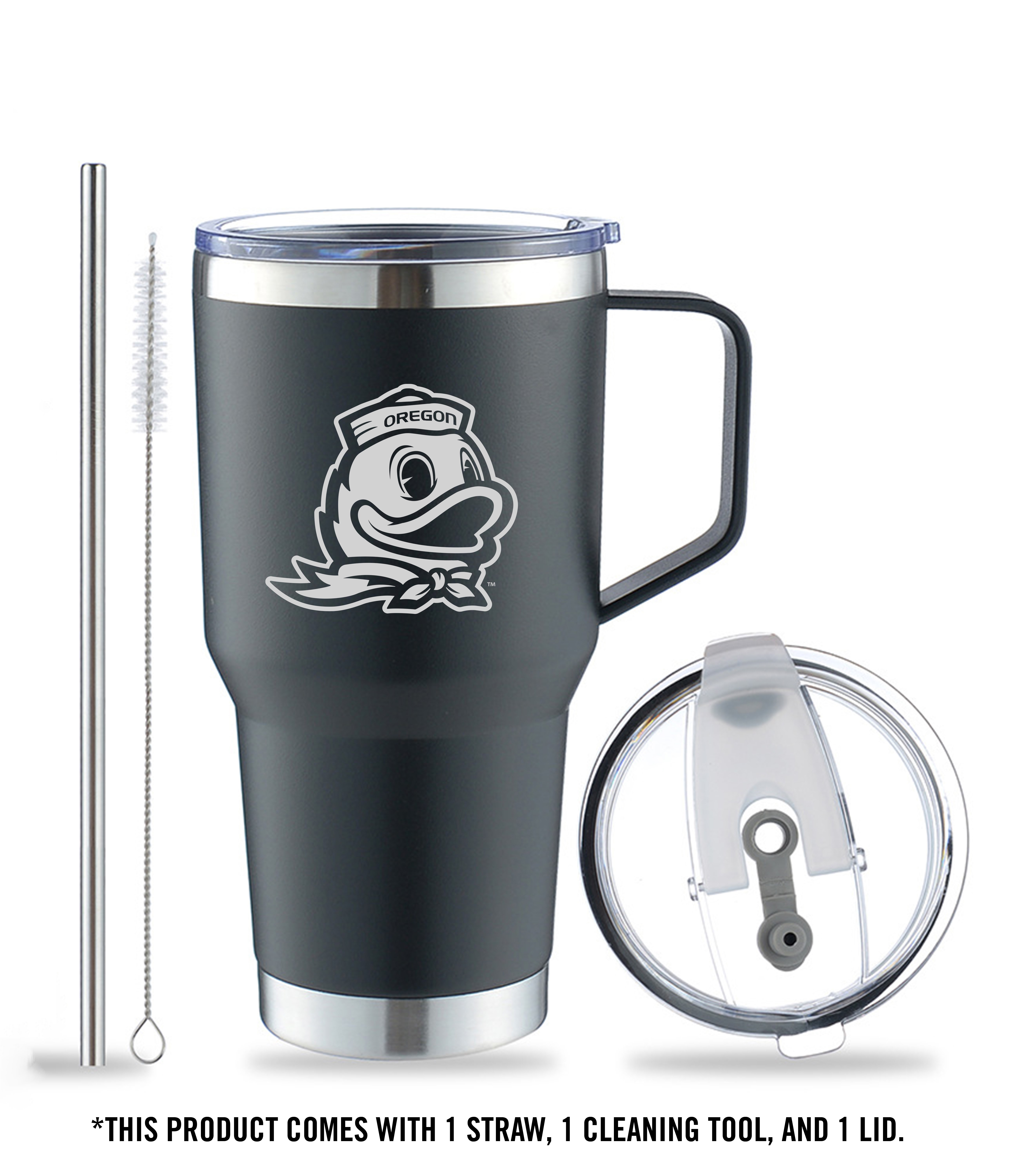 Support the Oregon Ducks with this 30 oz handled Tumber. This tumbler is made of 18/8 food grade stainless steel. Ensuring this tumbler is easier to clean, rust resistant and sturdy. The double-walled vacuumed insulated tumbler, which keeps cold drinks cold for 12 hours and warm drinks warm for 6 hours is ideal for outdoor activities or traveling long distances.Specifications