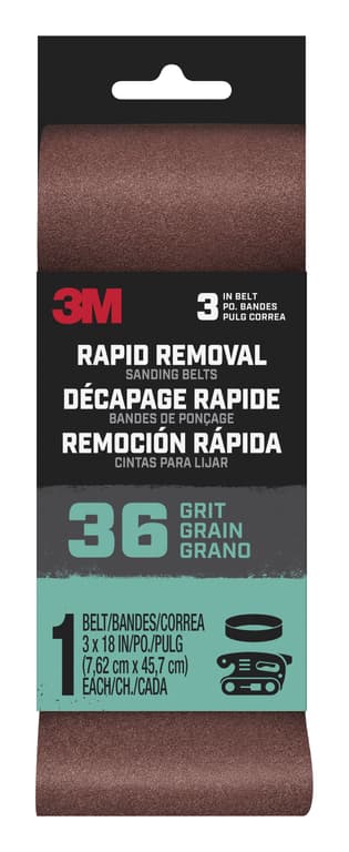 3" x 18" Sanding Belt - 36 Grit 3M Cloth Belts are designed for portable sanding Tool. These belts have abrasive grain and premium aluminum oxide blended minerals on a heavy Y weight cloth backing. The film splice allows for the belt to be run bi directional, making it economical and durable. Designed for portable sanding Tools. 3M Cubitron abrasive grain and premium aluminum oxide blended minerals on a heavy Y weight cloth backing. Film splice allows for the belt to be run bi-directional. Economical and durable. SpecificationsSize: 3" x 18" Grit: 36 GritSpecifications