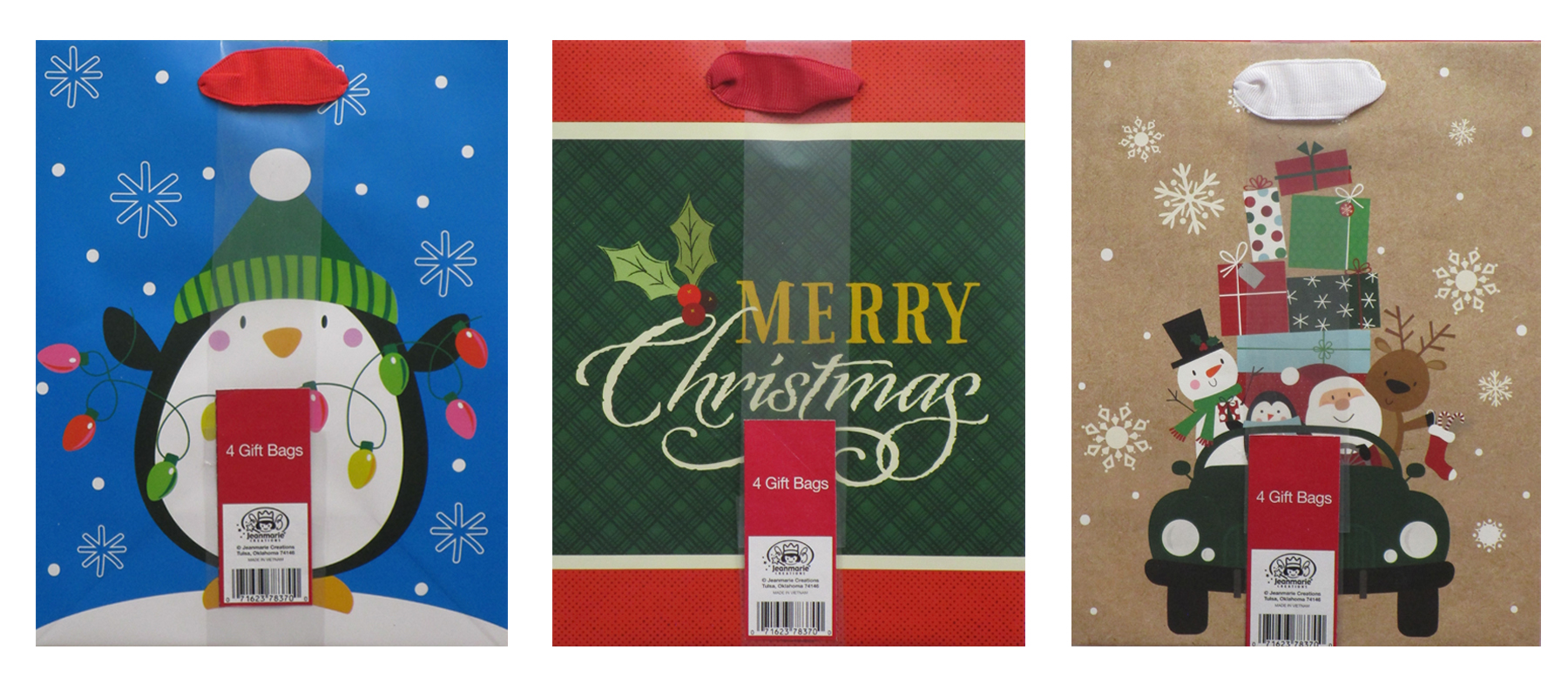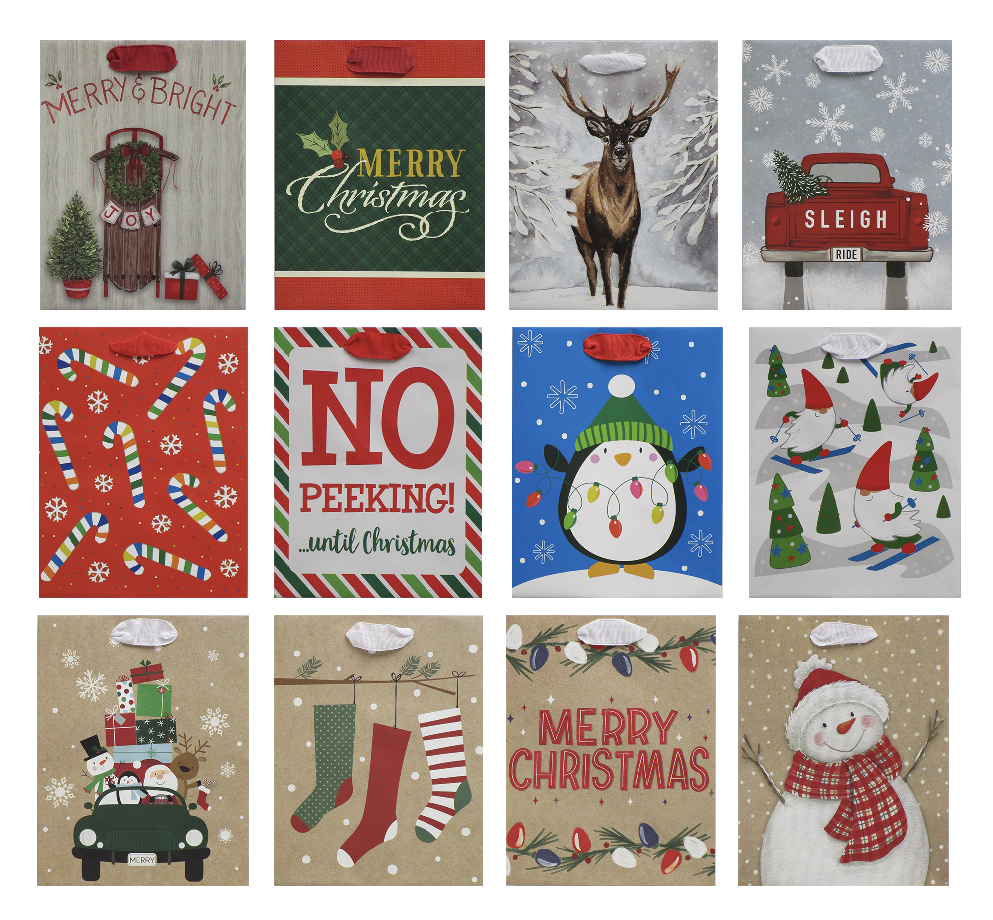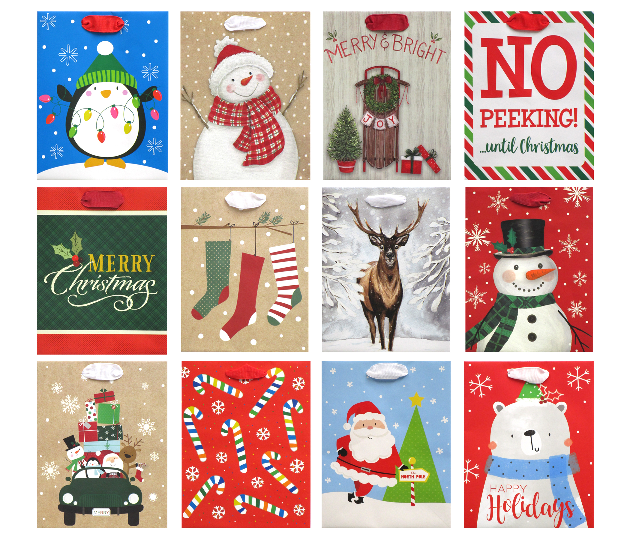 CHRISTMAS GIFT BAGS IN ASSORTED TRADITIONAL, WHIMSICAL AND KRAFT DESIGNS; 1 PC EACH OF 4 DESIGNS PER PACK; 9"H x 4"W x 7"dSpecifications