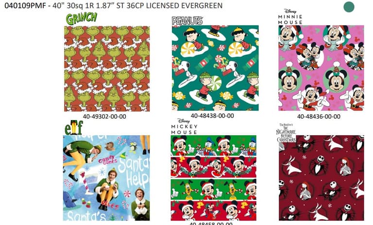 40 INCH X 30 FT ROLL; AMERICAN GREETINGS; ELF; GRINCH; LICENSED DESIGNS; MICKEY MOUSE; NIGHTMARE BEFORE CHRISTMAS; PEANUTS