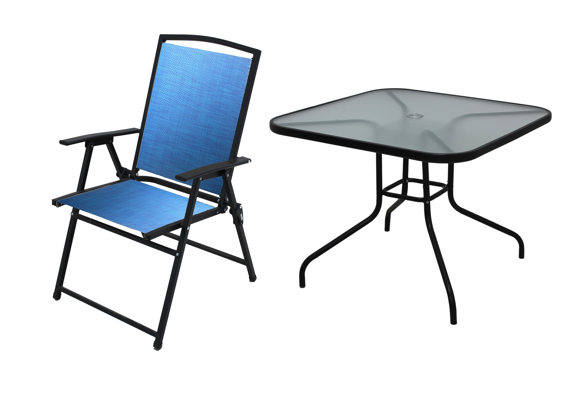5 Piece Textilene Sling Set w Folding Armchairs; Armchairs fold for easy storage; Chair Size: 24.8"D X 22.64"W X 37"H Table Size: 36"W x 36"D x 28"H; Steel Powder Coated Frames w Blue Textilene Sling Fabric; Table w tempered water wave glass and umbrella hole