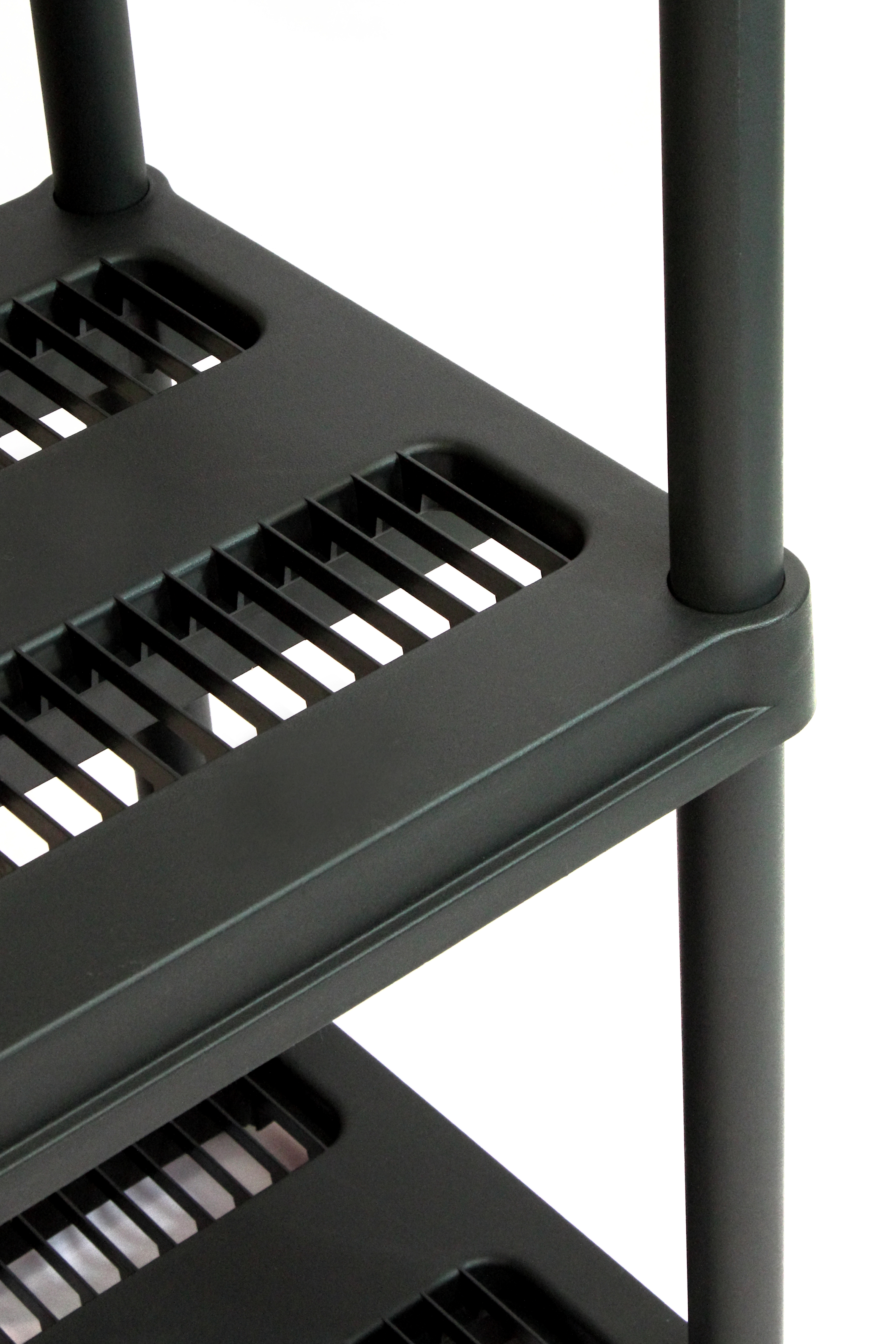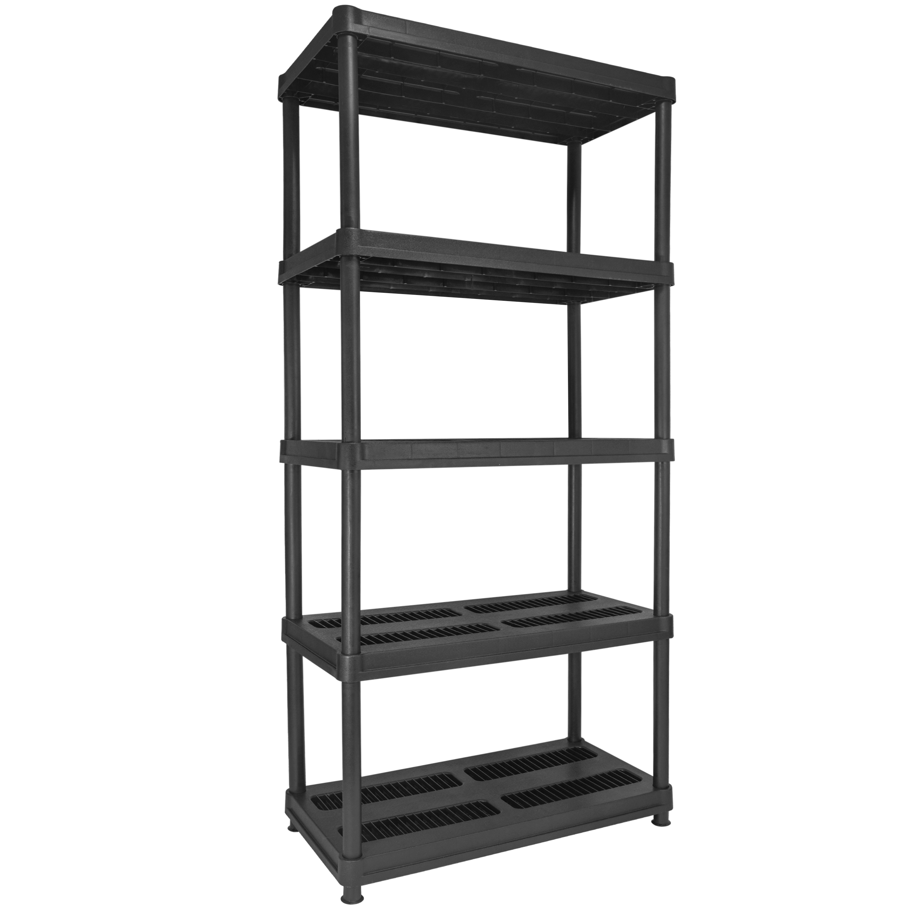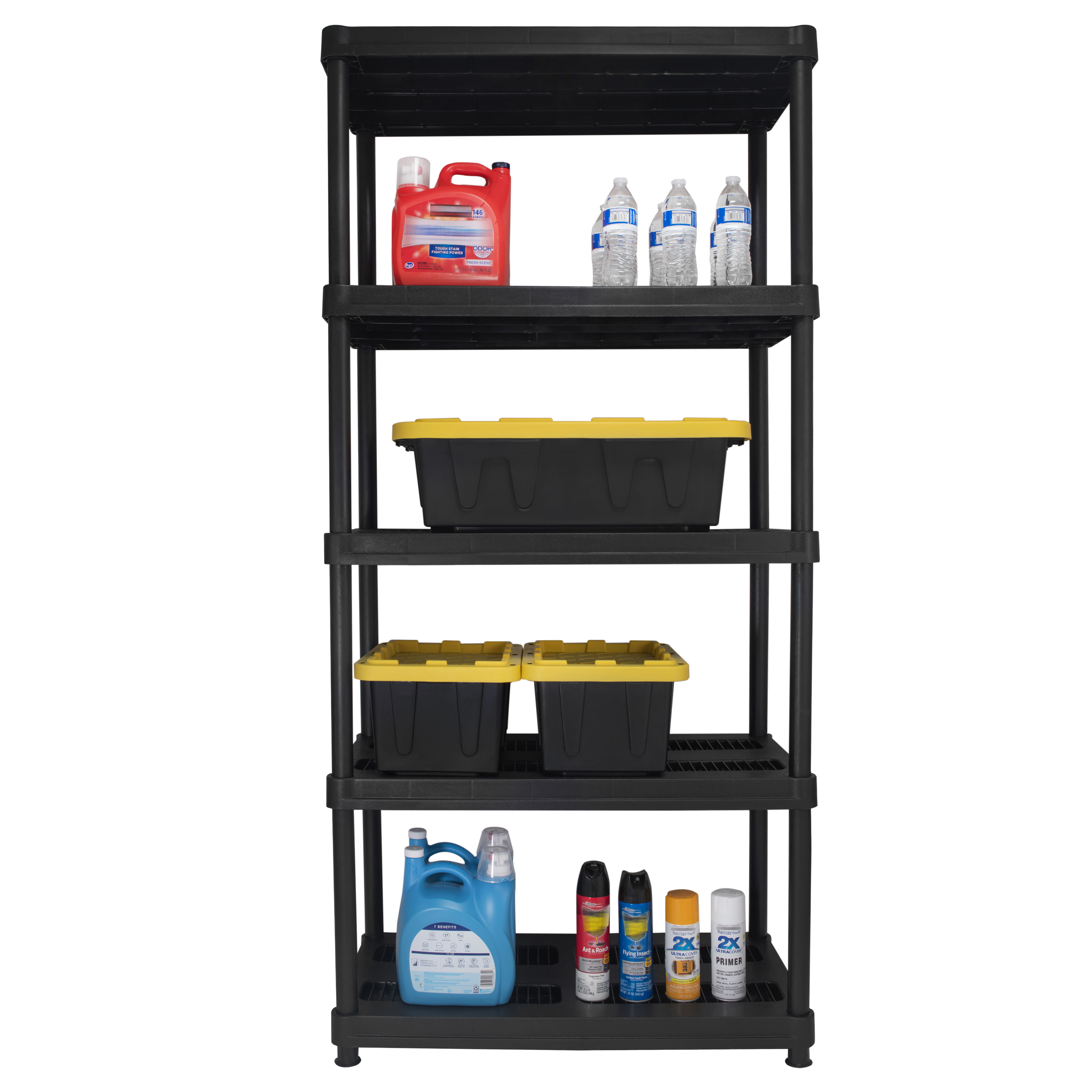 The Storagewares heavy duty plastic shelving unit is the perfect storage solution for organizing any indoor or outdoor space. This standalone shelf is ideal for laundry rooms, garages, basements, pantries, warehouses, or any cluttered home or office space. The sturdy light-weight design features 5 ventilated resin shelves that will never rust, dent, or peel and are chemical-resistant. No tools required assembly allows for a quick and easy set up in any space. ASSEMBLY REQUIRED.Specifications