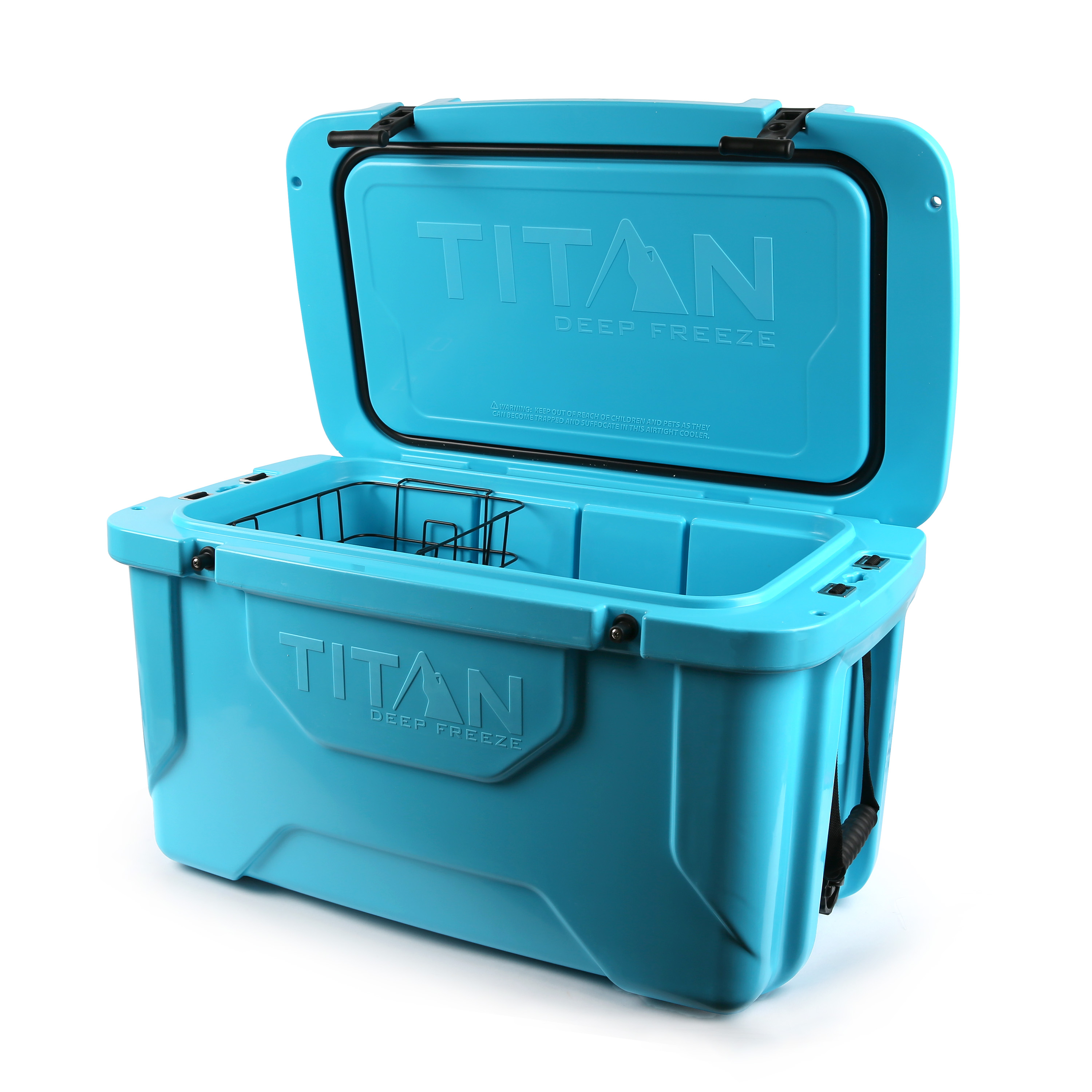 The Titan Deep Freeze 55 Quart High performance Roto Cooler has Microban antimicrobial protection built right into it and is constructed with a premium blend of thick polyurethane insulation that maximizes ice retention for up to 8 days!Microban is built-in protection that is guaranteed to last the lifetime of the product. It not only helps to prevent the build-up of bacterial odors and stains, but also makes the cooler easier to clean.The coolers uni-body roto molded construction, 360 rubber gasket and heavy-duty, corrosion resistant T-latches provide a tight seal to keep the cold inside.Also included is a sturdy wire basket to separate dry foods from wet, an oversized drain, anti-skid feet and an integrated fish ruler. And in case of unexpected campsite visitors, the Titan Deep Freeze Roto Cooler is certified bear resistant by the Interagency Grizzly Bear Committee!Specifications