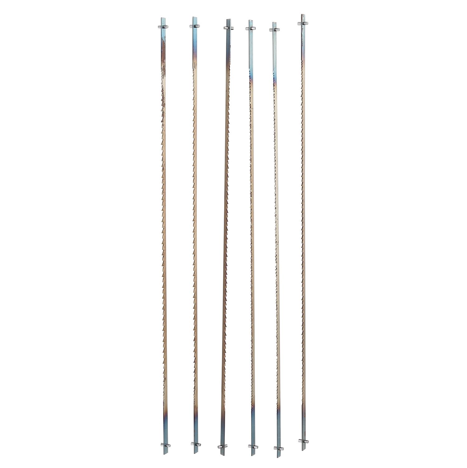 The 6 Piece Coping Saw Blade Set - Assorted includes 2 fine, 2 medium, and 2 coarse 6 inch blades made from alloy tool steel for strength and durability. This set fits GreatNeck and other popular coping saws.Specifications