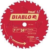 "Super thin laser cut kerf (small diameter blades only) provides faster, cleaner, more exacting cuts. Perma shield coating shields blade against heat, gumming, and corrosion. Durable micrograin titanium carbide Tipped teeth are impact resistant to hold their edge longer. Laser cut Stabilizer vents trap noise and vibration and stabilize blade. Laser cut heat expansion slots reduce heat and blade warp. Tri metal shock resistant brazing for stronger carbide teeth. For fast-acting blades that make clean cuts in a variety of framing material, look no further than the Freud D0724A Diablo 7.25-Inch Framing Saw Blade. Ideal for most general construction applications, these are your go-to blades for slicing through rough framing lumber, high-quality finish lumber, plywood, OSB (oriented strand board), and hardboard siding. For strong, long-lasting resistance, the blades feature a tough steel plate and high-density carbide tips. Model # D0724A Diameter 7-1/4" Machine Use Circular Saw Application Framing Teeth 24 ATB (Alternate-Top Bevel) Arbor 5/8" (Diamond knockout arbor) Kerf .059" Hook Angle 15° Makes Fast, Accurate Cuts in Framing Lumber and More Achieving premium results when creating frames for houses and other building structures is all about clean, razor-sharp cuts. The Freud D0724A blades make this process easy and precise. These blades feature versatile capabilities and quick performance, making them ideal for general construction jobs.Housing contractors, construction workers, and avid do-it-yourselfers will want to keep these blades on hand for jobs that call for ripping or crosscutting framing lumber. Appropriate application materials include plywood, OSB (oriented strand board), hardboard siding, and both rough and finish lumber.Produces Smooth, Quiet Cuts with Laser-Cut Kerf The Freud D0724A blades' clean-cutting design means that you can enjoy the comfort of smooth performance. The thin 0.59-inch kerf between each of the blade's 24 ATB (alternate-top bevel) teeth is laser cut to provide ease of feed, so you have more control over each blade's position. This helps maximize both the accuracy of the cut and the efficiency of your work, so you can enjoy a job well done and the ability to complete more tasks in less time.An added bonus, the blades' laser-cut stabilizer vents will reduce noise and vibration during operation, keeping your work environment more relaxed and your hands more in control. This feature also reduces friction to the blades, helping extend their cutting life.Features Shock-Resistant Carbide for Long-Lasting Precision So you can count on it over the long term, the Freud D0724A blades are designed for durability. The blades' hardy teeth are protected by Freud's exclusive shock-resistant TiCo Hi-Density Carbide formula, which helps fight wear and tear and maintains blade sharpness up to four times longer than standard carbide. And protecting the blades is a Perma-Shield Non-Stick Coating that provides resistance to heat and corrosion.Fits Circular Saws The Freud D0724A blades are a great addition to your workshop because they are designed with the versatility to fit a variety of circular saws.This product is covered by Freud's Limited Lifetime Warranty.What's in the Box Freud D0724A Diablo 7.25-Inch Framing Saw Blades. This saw blade is ideal for creating frames for structures like houses and decks. "Specifications