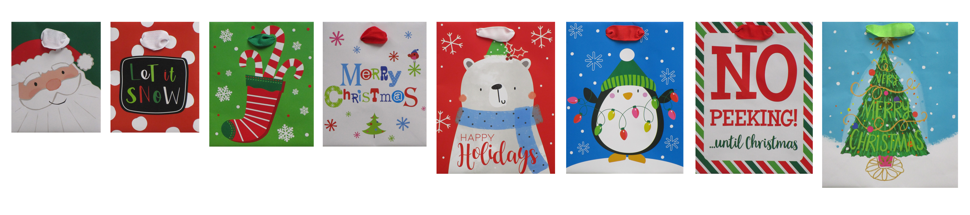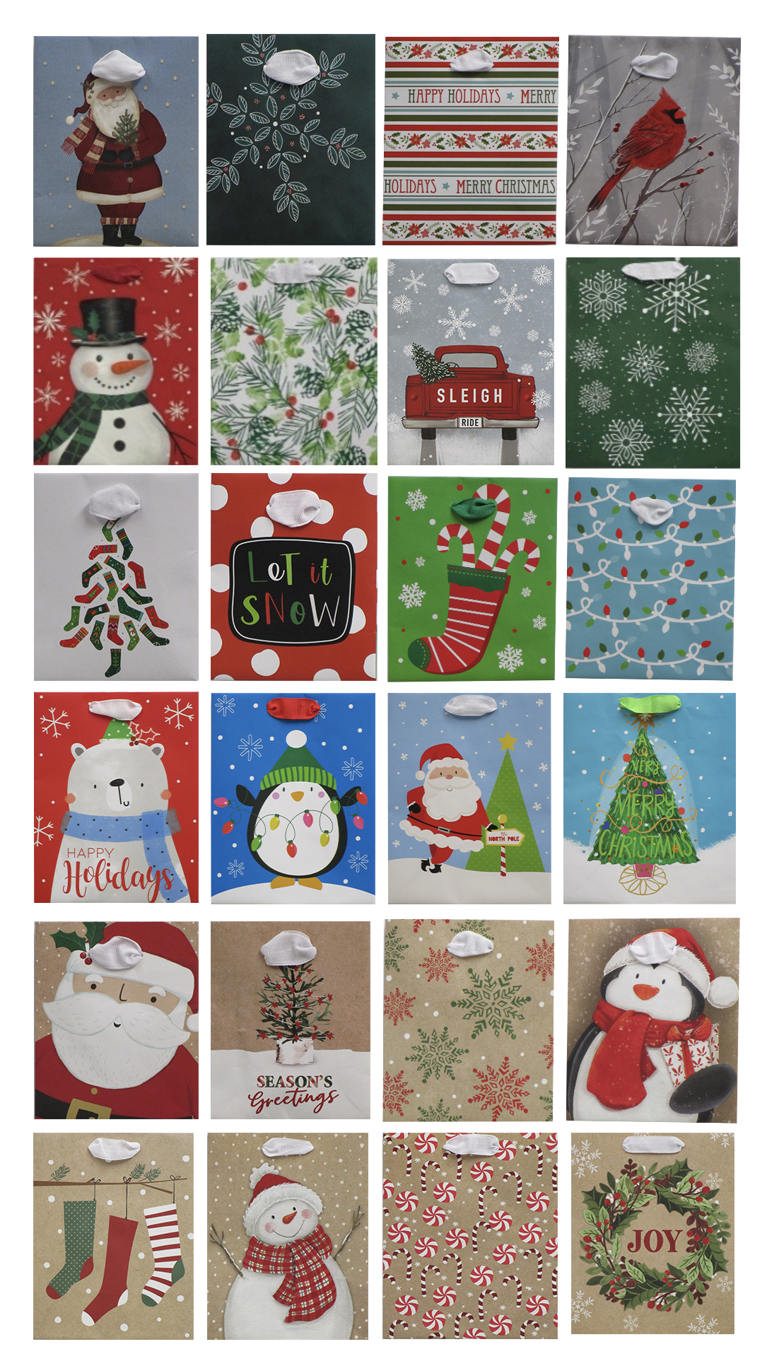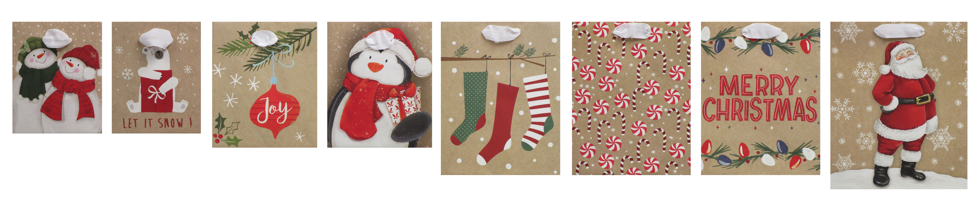 CHRISTMAS GIFT BAGS IN ASSORTED TRADITIONAL, WHIMSICAL AND KRAFT DESIGNS; 8 DESIGNS PER PACK AND 4 VARIOUS SIZES; 5"H x 2.5"W x 4"D, 6"H x 3.5"W x 5"D, 9"H x 4"W x 7"D, 11"H x 4"W x 9"DSpecifications