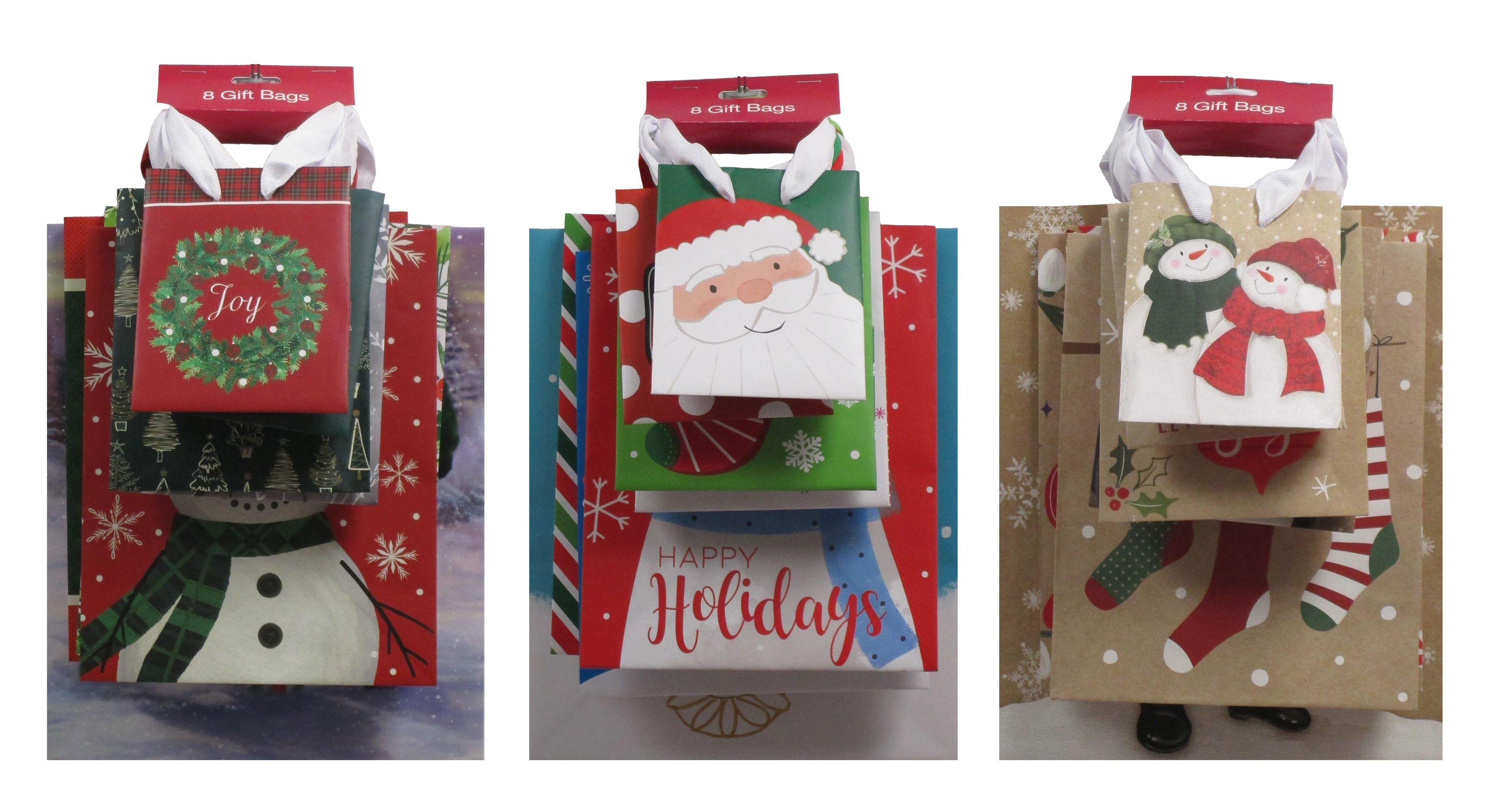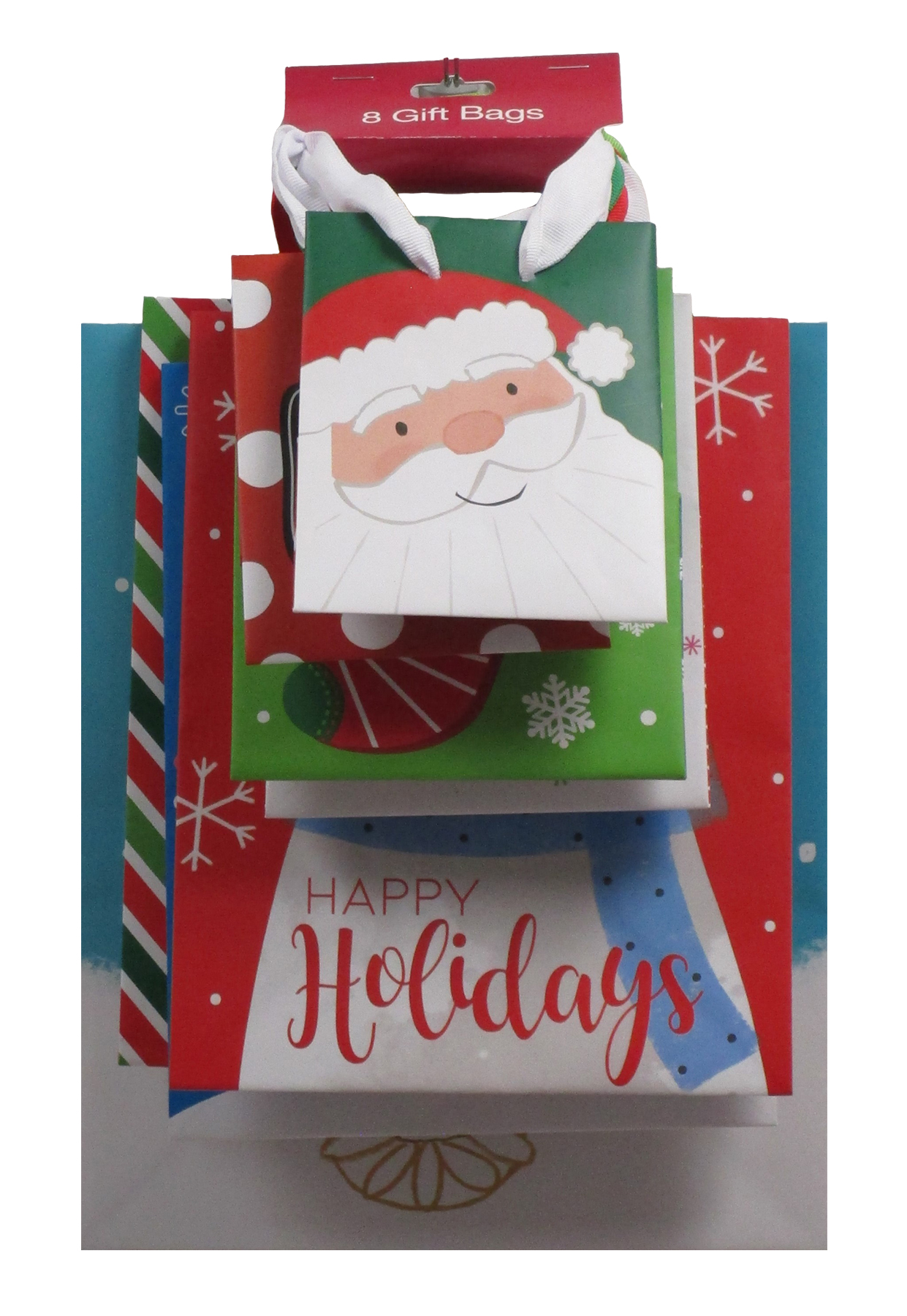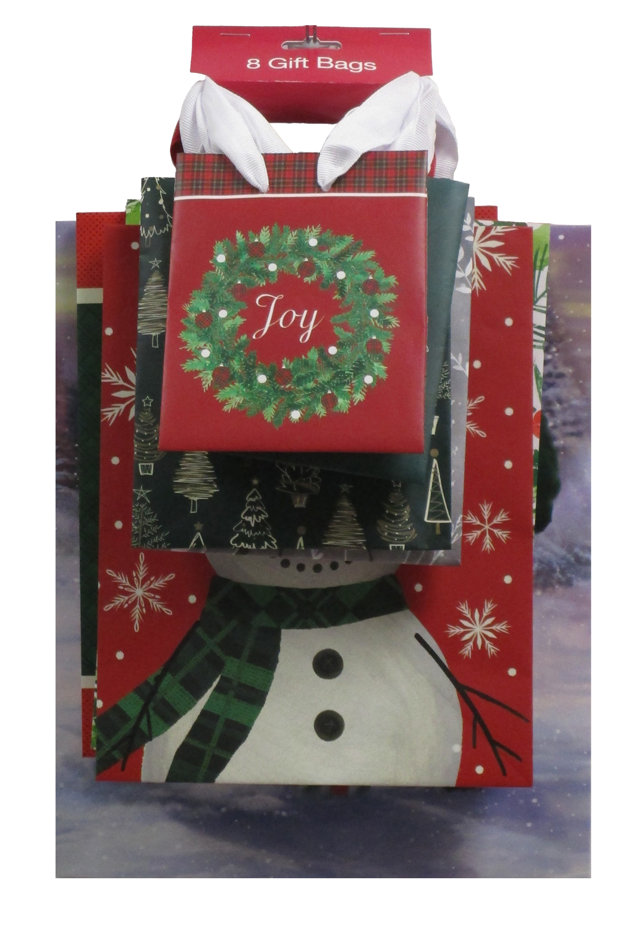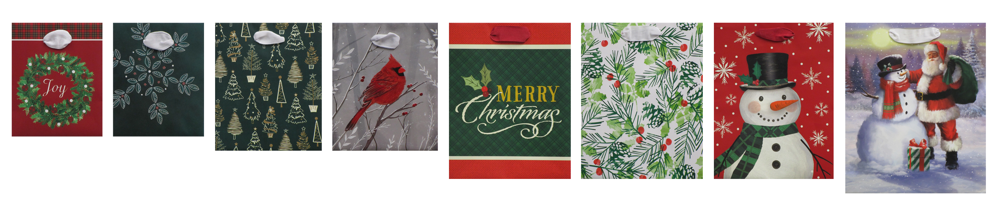 CHRISTMAS GIFT BAGS IN ASSORTED TRADITIONAL, WHIMSICAL AND KRAFT DESIGNS; 8 DESIGNS PER PACK AND 4 VARIOUS SIZES; 5"H x 2.5"W x 4"D, 6"H x 3.5"W x 5"D, 9"H x 4"W x 7"D, 11"H x 4"W x 9"DSpecifications
