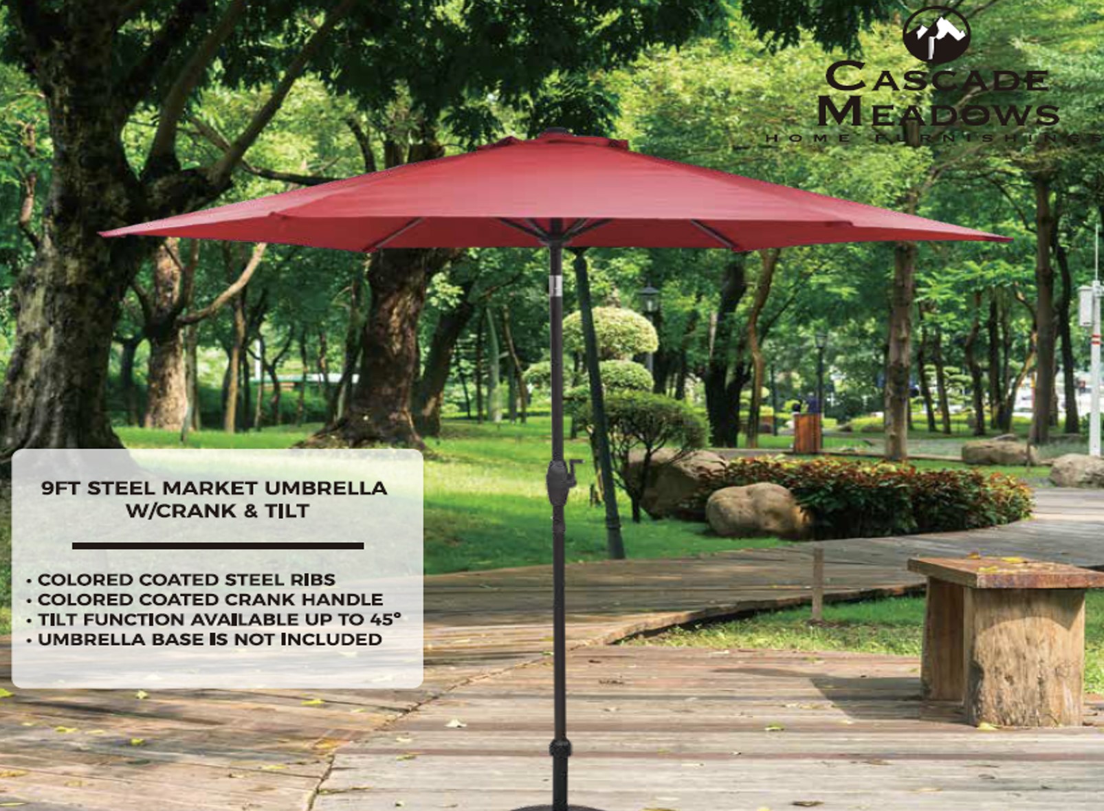 This Market Umbrella will provide great shade for your backyard and garden oasis. Measures 9 feet in diameter and features crank and tilt functions. Comes with a bag in matching color for easy storage. Great addition to your outdoor living.Specifications