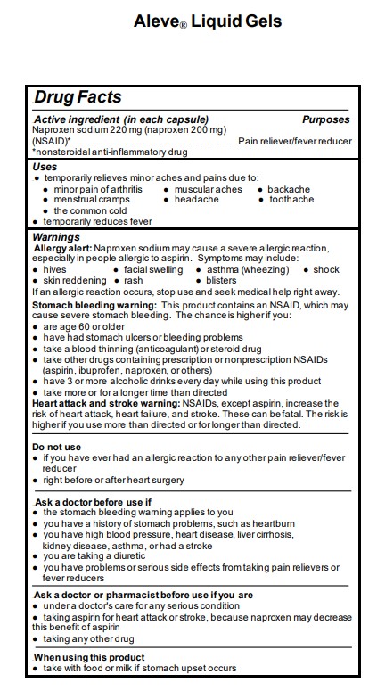Aleve is a non-steroidal anti-inflammatory drug that has provided temporary relief from minor aches and pains for 25 years.; Aleve works on the pain site all day with just two pills.; Get fast and continuous pain relief with Aleve Liquid Gels.; temporary relief from minor aches and pains due to backaches muscle aches headaches minor arthritis and other joint pain menstrual pain toothaches and the common cold. It also temporari