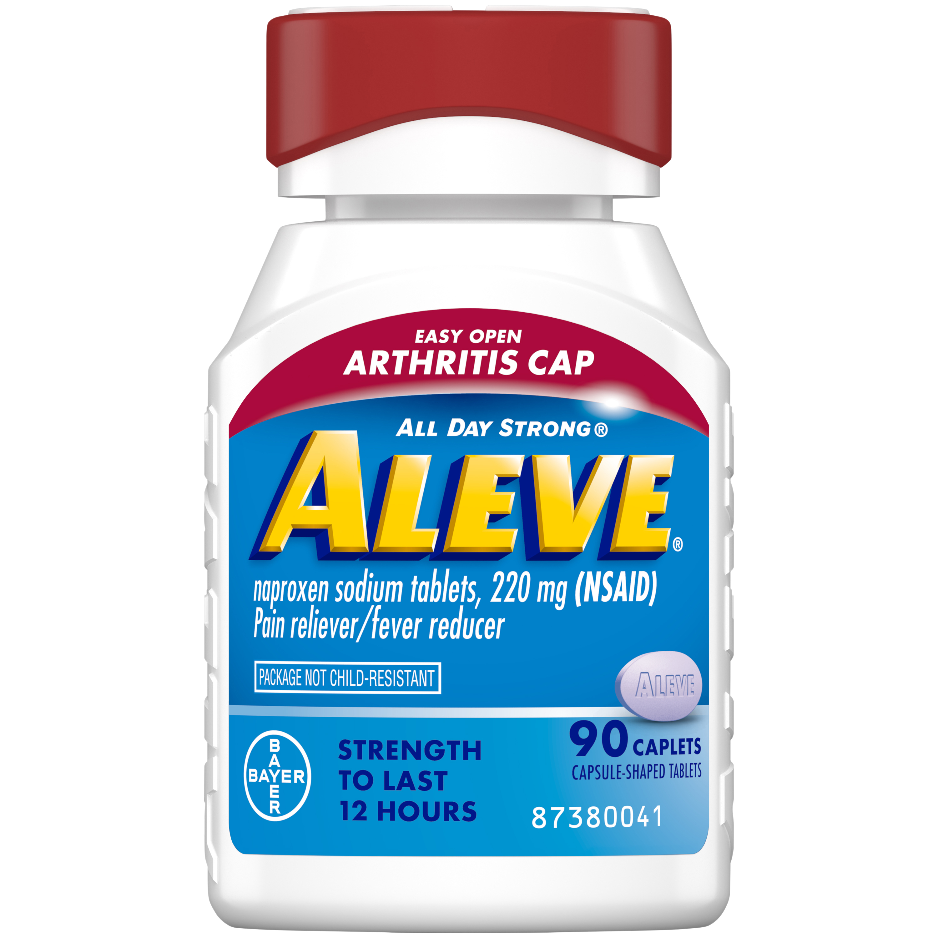 Aleve Pain Relief Naproxen Sodium Tablets are proven stronger and longer on pain than Tylenol Each Naproxen Sodium 220 mg pain medicine has the strength to last up to 12 hours. Aleve Naproxen Sodium Pain Relief Tablets provide all day strong relief from minor arthritis, backaches, menstrual cramps, muscular aches, backache, toothache, headache and the common cold. The Aleve pain reliever also temporarily reduces fever. This pain medication also comes in an Easy Open Cap that is covered with a cushioned material to give you better control. Not child resistant. Pain happens. Aleve it. Based on clinical data from the first six hours after initial dosingSpecifications