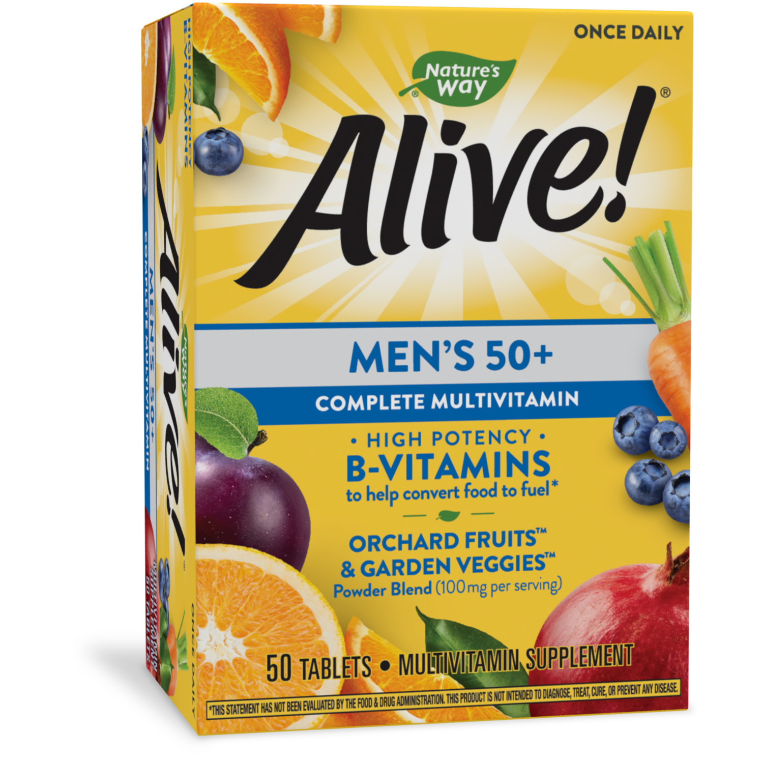 Alive! Once Daily Men’s 50+ Ultra Potency Multi-Vitamin & Whole Food Energizer The most complete once daily multi-vitamin for Men 50+, with 26 Fruits & Vegetables, 23 Vitamins & Minerals, 14 Green Foods, 12 Organic Mushrooms, 12 Digestive Enzymes. Alive! Ultra Potency is nutrition you can feel with more energizing nutrients from more natural sources than other multi-vitamin brands. Extra B-vitamins for energy.Contains 19 vitamins & minerals at 100% or more daily value in addition to unique food-based blends. Premium B-Vitamins: Featuring the active form of B12 (methylcobalamin) and folate (L-Methylfolate) to help convert food into energy" Premium formula blends include Orchard FruitsTM & Garden VeggiesTM and Daily GreensTM powder blends, and nutrients. Supports bone health, energy metabolism, eye health, heart health, and immune health. Contains antioxidants vitamin A, vitamin C, vitamin E, and selenium.Specifications