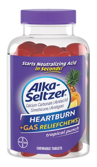 Alka Seltzer Heartburn Relief and Gas Relief Chews deliver fast and powerful heartburn, gas and bloating relief. These heartburn and gas chews contain calcium carbonate that starts neutralizing stomach acid in seconds, with simethicone that reduces bloating and pressure. These antigas and antacid tablets bring you fast acting and effective relief of heartburn, acid indigestion and upset stomach associated with these symptoms while alleviating that stuffed feeling commonly referred to as gas. Offering a delicious tropical punch flavor without the chalky or gritty taste, these Alka Seltzer Relief Chews provide gas and heartburn relief that's easy to take with you everywhere.Specifications