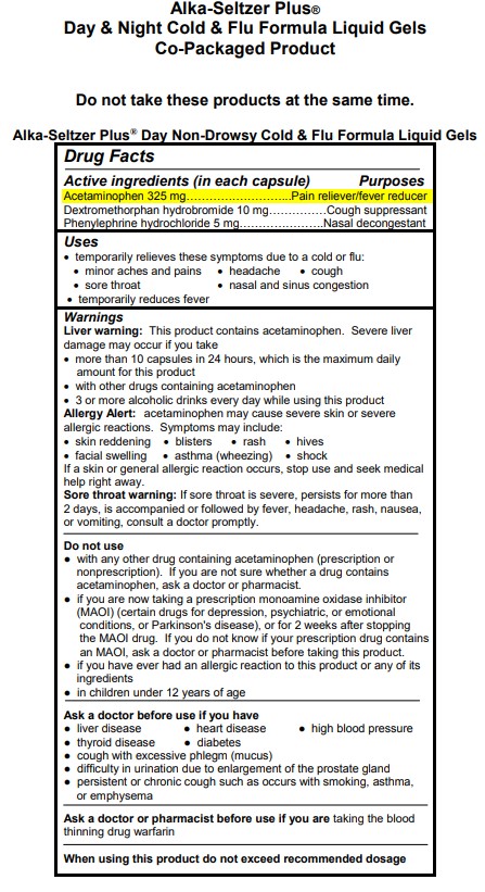 Day & Night Cold & Flu Liquid Gels; Daytime relief from Nasal & Sinus CongestionCoughSore ThroatFeverHeadacheBody Aches & Pains; Nighttime relief from CoughSneezingRunny NoseNasal CongestionSore ThroatSinus Congestion & PressureFeverHeadache Body Aches & Pains; Non-drowsy Liquid filled capsules; Pain reliever-fever reducer