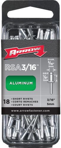 Aluminum rivets Use aluminum rivets for lighter weight jobs and materials such as aluminum, fabrics, plastics, leather, and more 3/16" diameter 1/8" grip range 18 per pack Width: 1.57Height: 4.05Specifications