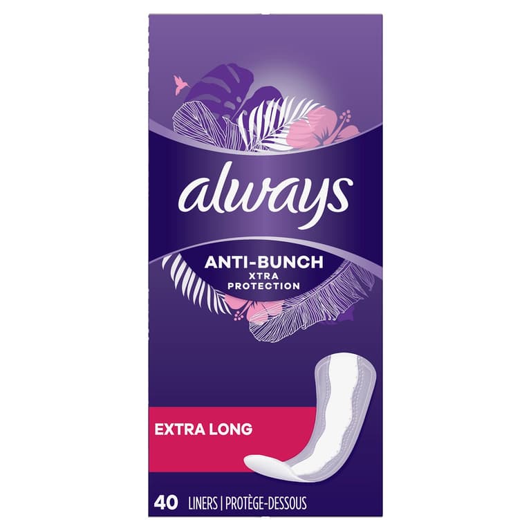 Looking for all-day freshness no matter how you move? Always Anti-Bunch Xtra Protection Daily Liners Long are designed to give you reliable protection with Anti-Bunch Technology. These pantiliners are 5X drier than Always Thin and feature a dual layer design to quickly absorb and lock away leaks to keep you feeling clean for up to 10 hours. Always liners feature a special Edge-2-Edge adhesive that holds better than traditional adhesives. That means once the liner goes on, you can trust that will stay in place no matter what activities you take part in. Errands, exercise, sports and other physical activities won't stand a chance against this superior adhesive option. There's no reason to worry about what your day will entail because these Always panty liners won't budge. The Always Liners Fit sizing chart shows a range of liners for different shapes and needs so you can find your best fit.Get daily protection with Anti-Bunch Technology, so you feel fresh and clean, every day. Always pantiliners are designed to offer a shower-fresh feeling when you wear them, almost as if they weren't there at all. The top layer is breathable to prevent moisture from reaching your skin while the inner layers absorb and lock away wetness for a fresh feeling every day. Plus, Always cares about the environment and each of the Always liners is produced with as little impact on the environment as possible.Specifications
