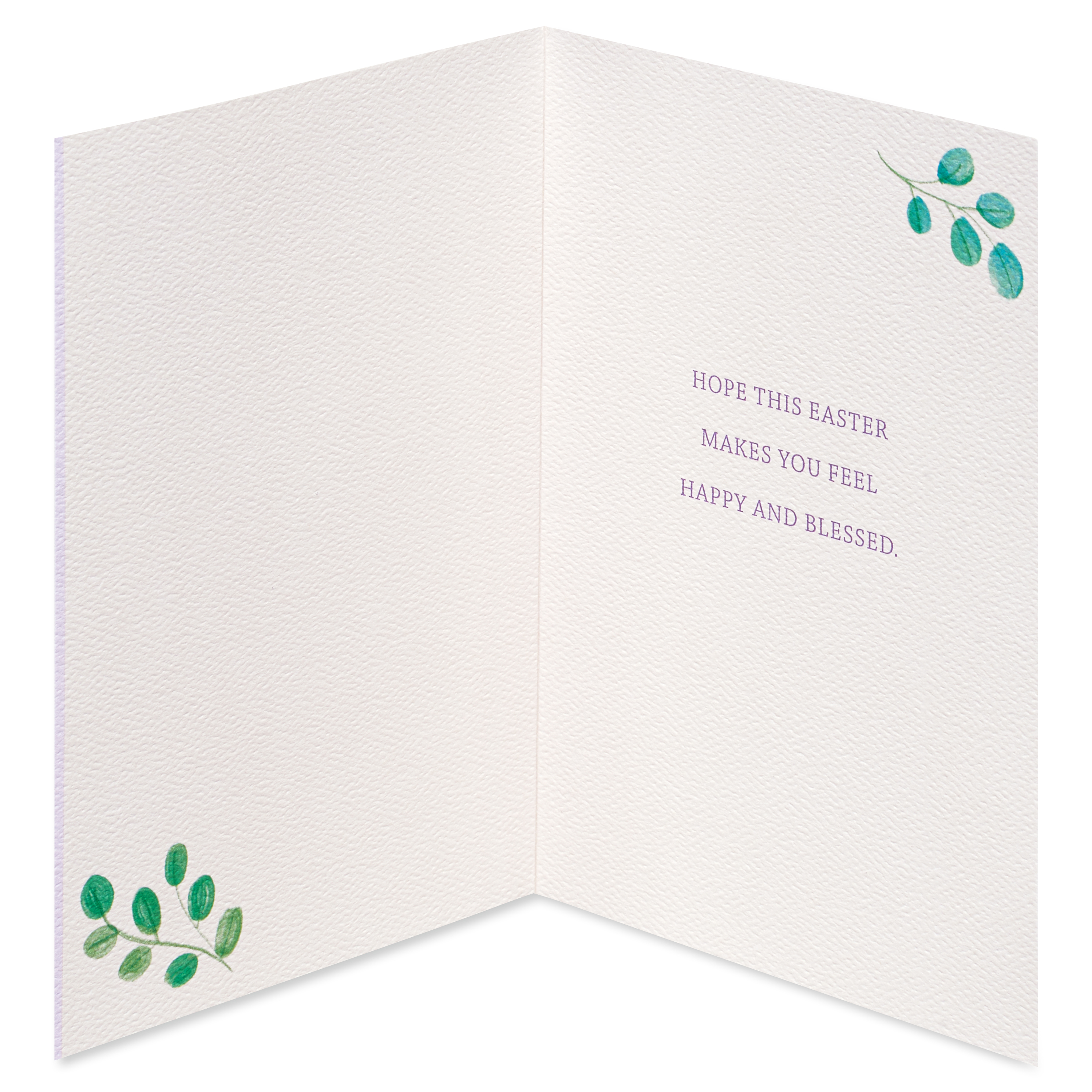 Card measures 4.625 in x 6.75 in. Envelope included; Front Message: Blank; Inside Message: Hope this Easter makes you feel happy and blessed; This American Greetings Easter card feature layers of pastel colors surrounding a cross embellished by gold foil