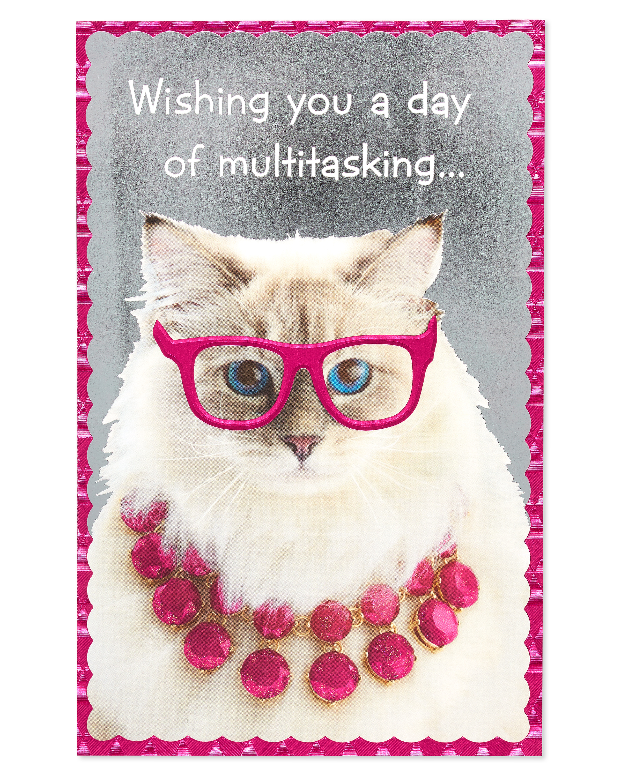 American Greetings offers exceptional greeting cards gift wrap and celebration products so you can connect in ways that fit your personality and authentic style; Card measures 5.357 in. x 8.25 in.; Envelope included; This card features an adorable cat in glasses and a necklace with magenta and silver foil accents.