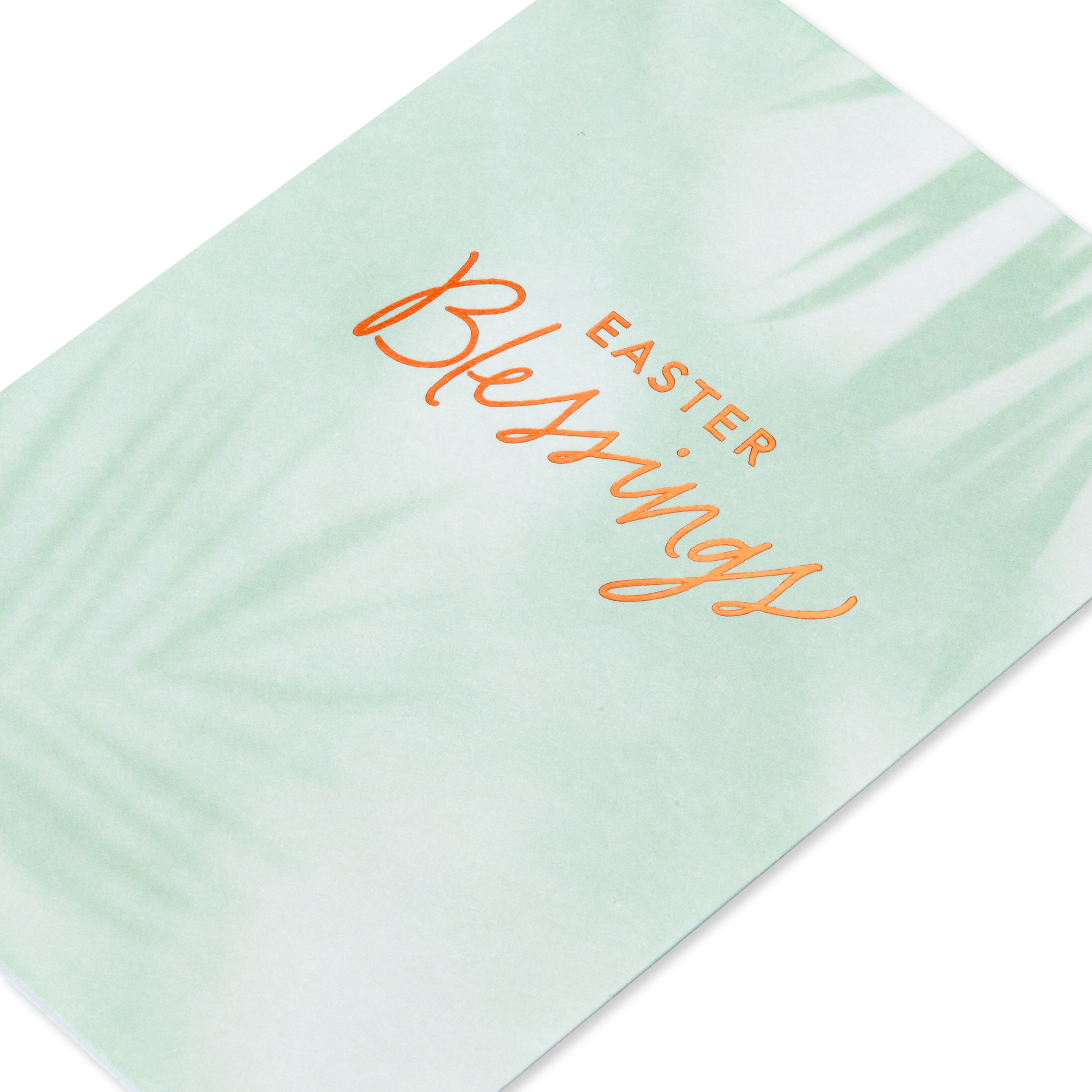 Front Message: Easter Blessings; Inside Message: Wishing you God's goodness and grace; This American Greeting Easter card features a light green floral background created by subtle brushstrokes, while "Easter Blessings" is embellished by bright copper foil