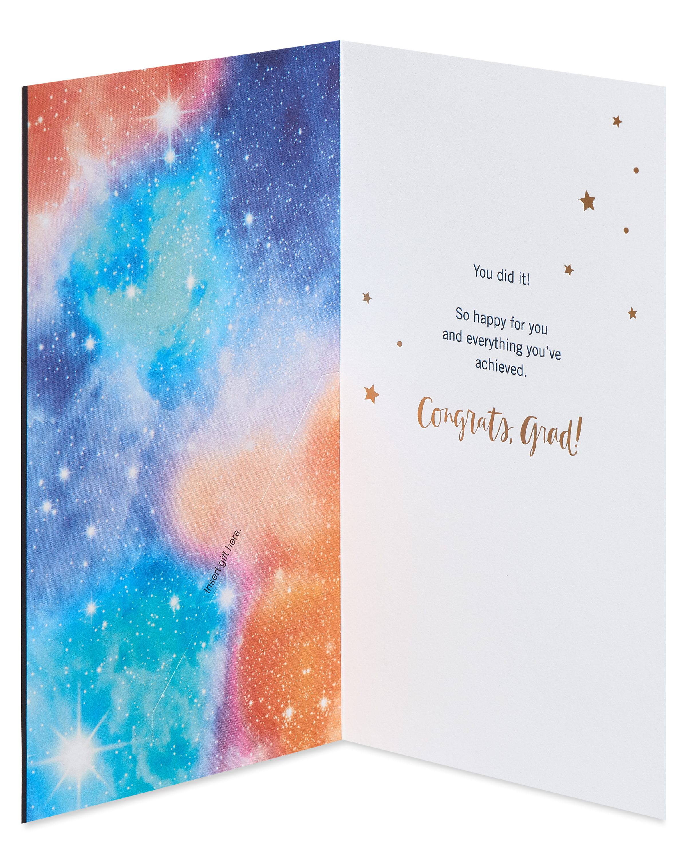 Give the graduate another reason to smile with this graduation card from American Greetings. This card features a slot for money or a gift card inside and outside a fun rhyme in a starry sky design on a black background with gold foil stamping. The message celebrates everything the graduate has achieved and there’s even a little room to write your own personalized note. Give it to high school, technical school, college, or any other kind of graduate. Congratulate the grad with a card from American Greetings.Specifications