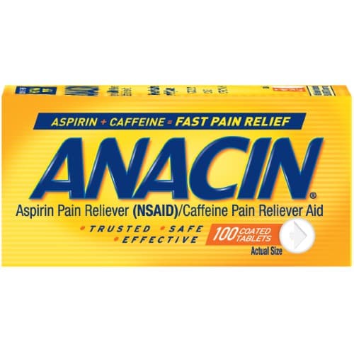 Anacin contains two important ingredients aspirin and caffeine to deliver fast headache relief.Aspirin works to deliver tough headache and pain relief.Caffeine complements and enhances aspirin's pain relieving action. Together, aspirin and caffeine work to deliver fast and effective headache relief when you need it most.#Feel Better Fast. That’s the Anacin Advantage.Specifications