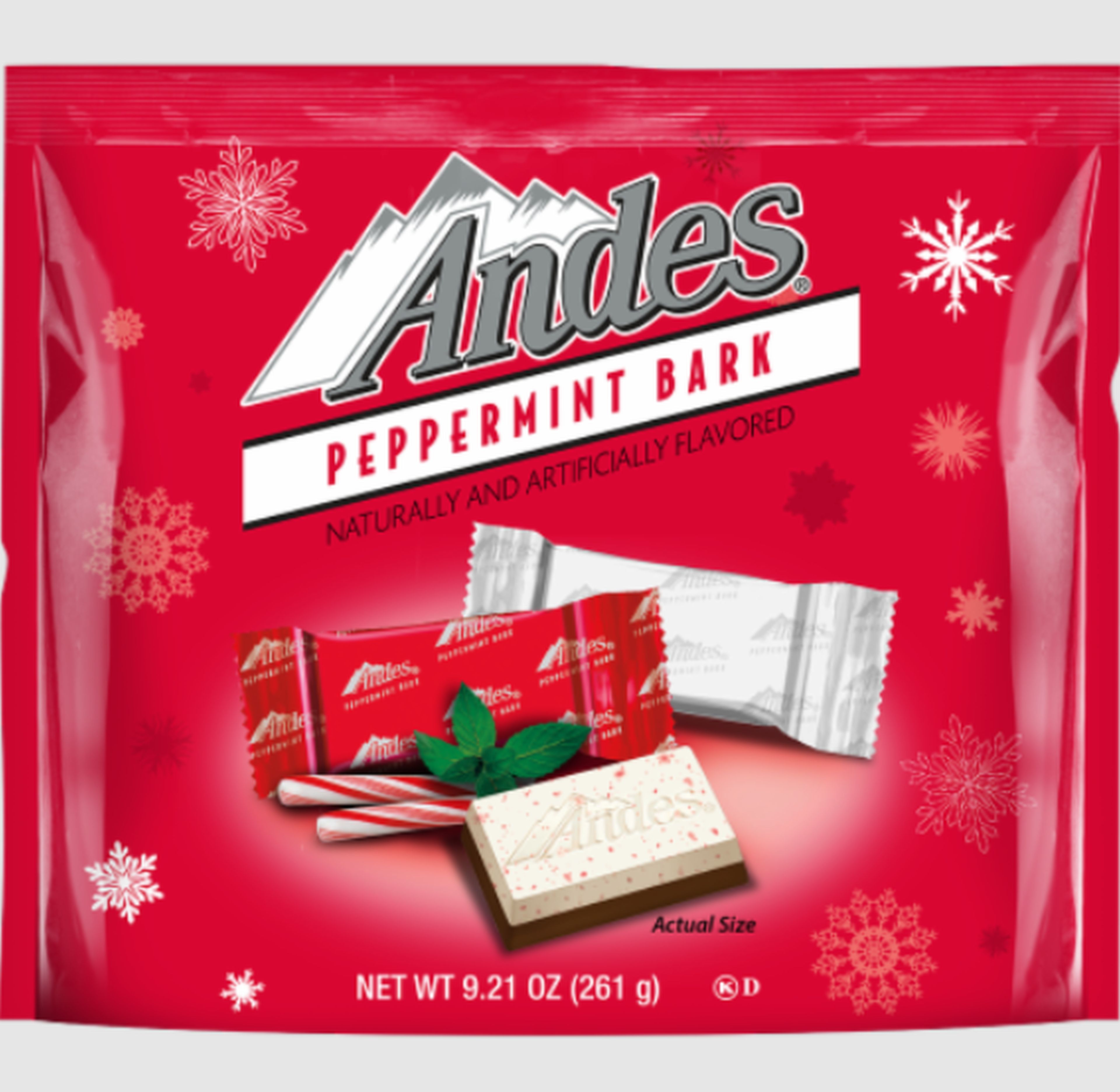 ANDES PEPPERMINT BARK IS A SIMPLY DELIGHTFUL COMBINATION OF CREAMY WHITE AND DARK CHOCOLATE LAYERS WITH REFRESHING PEPPERMINT THAT MELTS IN YOUR MOUTH. EACH PIECE IS WRAPPED IN FESTIVE RED AND WHITE FOILS MAKING THEM PERFECT FOR THE HOLIDAYS.Specifications