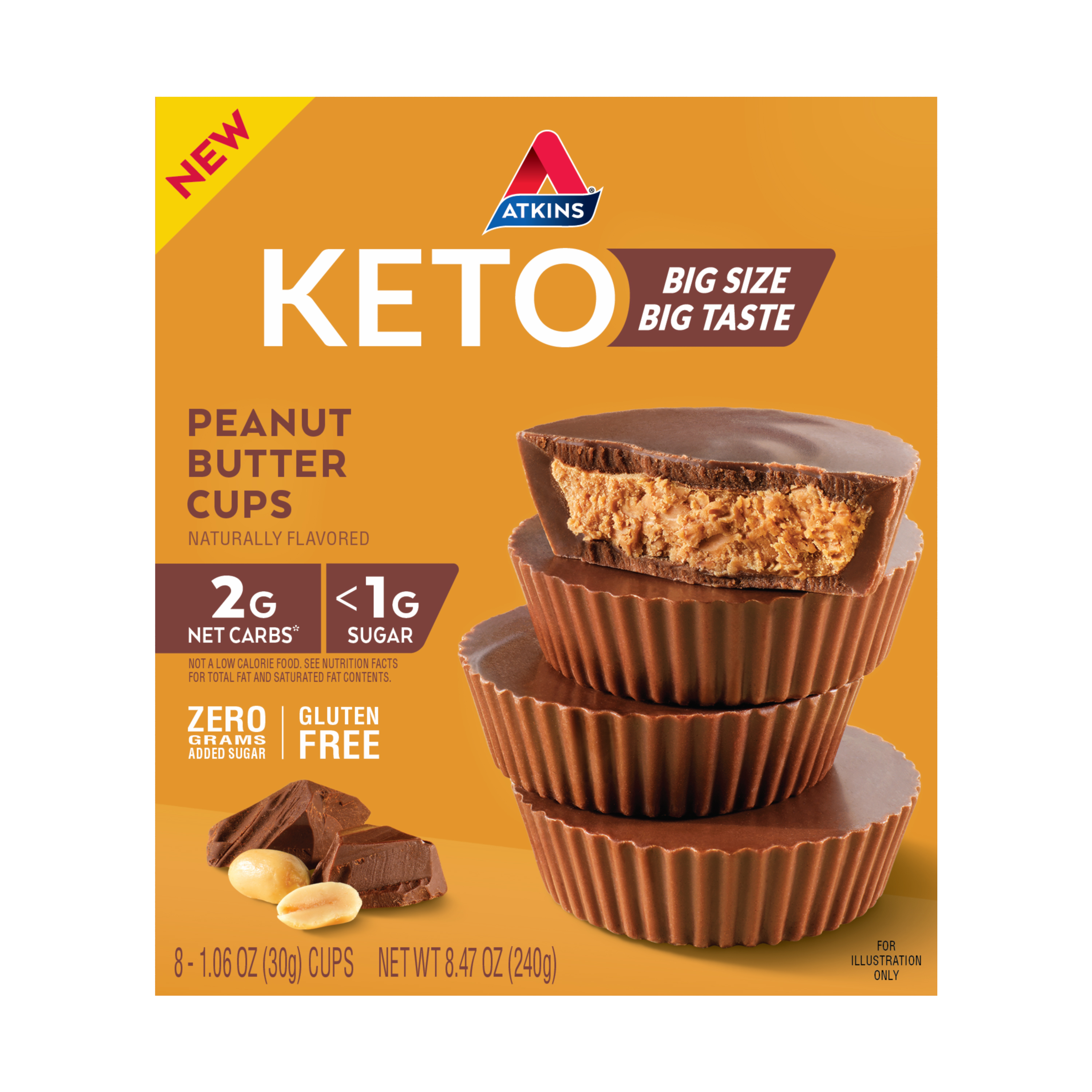 Atkins Keto Peanut Butter Cups are 75% larger and have 40% more creamy peanut butter than our original Peanut Butter Cups. What does that mean for you? That means more satisfyingly sweet peanut butter cups that allow you to stick to Keto the Atkins Way. Yum.Specifications