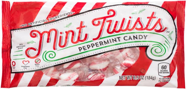 6.5 OZ; ALL NATURAL MINT; MINT TWISTS; NO ARTIFICIAL INGREDIENTS; PEPPERMINT; RED AND WHITE STRIPED