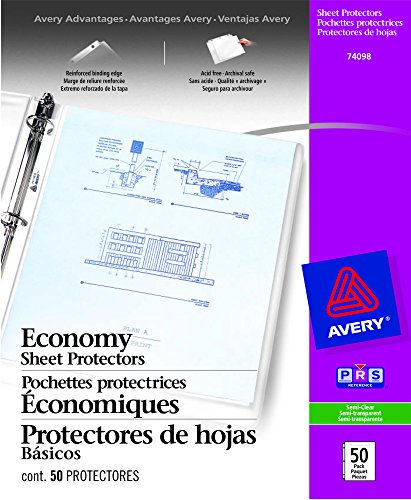 Avery 74098 Economy Sheet Protector - For Letter 8.50 x 11 Sheet - Ring Binder - Rectangular - Semi Clear - Polypropylene - 50 / Box. Ensure that your important papers last as long as you need them. These sheet protectors provide your documents with quality protection that allows you to view your papers with impressive clarity. The acid-free and archival-safe material wont stick to your papers so print stays on your documents rather than clinging to the plastic covering. With these convenient sheet protectors you can preserve the look and condition of your papers for maximum efficiency.Specifications