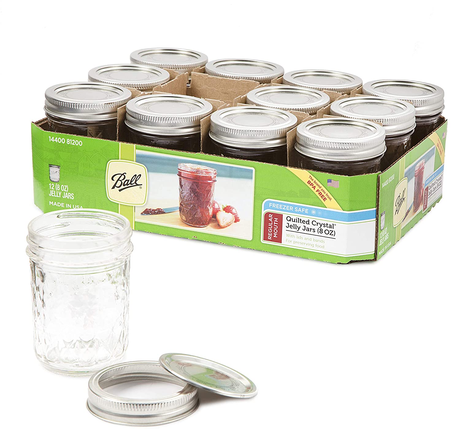 Ball Regular Mouth Half Pint (8-Ounce) preserving jars are ideal for fresh preserving recipes such as jams, jellies, sauces, mustards and flavored vinegars . These jars are BPA-Free. This famous glass jars and closures go beyond fresh preserving to help you serving, creative decor and gift-giving. Wide Mouth jars work with pourable foods such as jams and jellies, salsas, pie fillings or chopped fruits and vegetables. This order includes 12-Regular Mouth glass preserving Mason Jars, 12-Regular Mouth Lids, 12-Regular Mouth Bands. Made in USASpecifications
