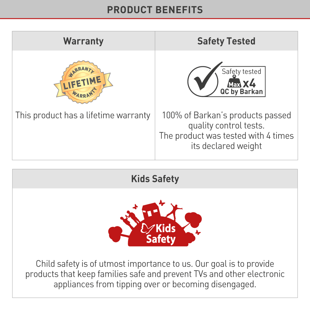 Fall Proof - Inner structure prevents disengagement of the screen; Lifetime Warranty; Patented mechanism to fit various screen types; Tested holding 4 times its max declared weight; Touch & Tilt - Tool free tilt adjustment.