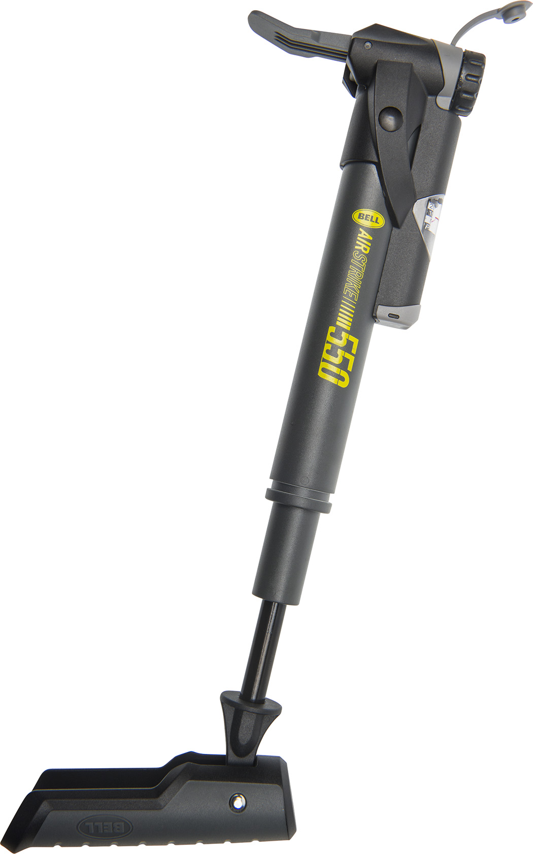 This Bell Sports Airstrike Frame Pump will make a handy addition to your garage with a functionality that you can rely on. It features a convenient telescoping barrel that saves space and pushes 35 percent more air per stroke than similar compact designs. This bicycle frame pump with gauge has a reversible pump head that makes it suitable for use with Schrader and Presta valves. The pivoting, soft-touch T-Handle offers a sure grip so you can fill up your tires with ease. The included gauge is easy to read and ensures your tires are at the optimum pressure. This bicycle accessory has a mounting bracket included so you can keep your garage neatly organized. The pump has a 550 high-pressure action that will fill your tires up quickly. It's designed with a two-stage operation that offers you a convenient method for maintaining your bicycle. The Bell Sports Airstrike Frame Pump has a dark gray color that is easy to locate.Specifications