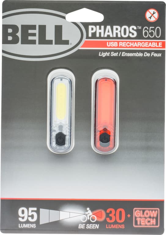 Small but mighty Pharos 650 light set combinesa bright 95 lumen headlight with a 30 lumen tail light. USB charging cord included--no more batteries to buy! Eight super bright modes. No tools instal