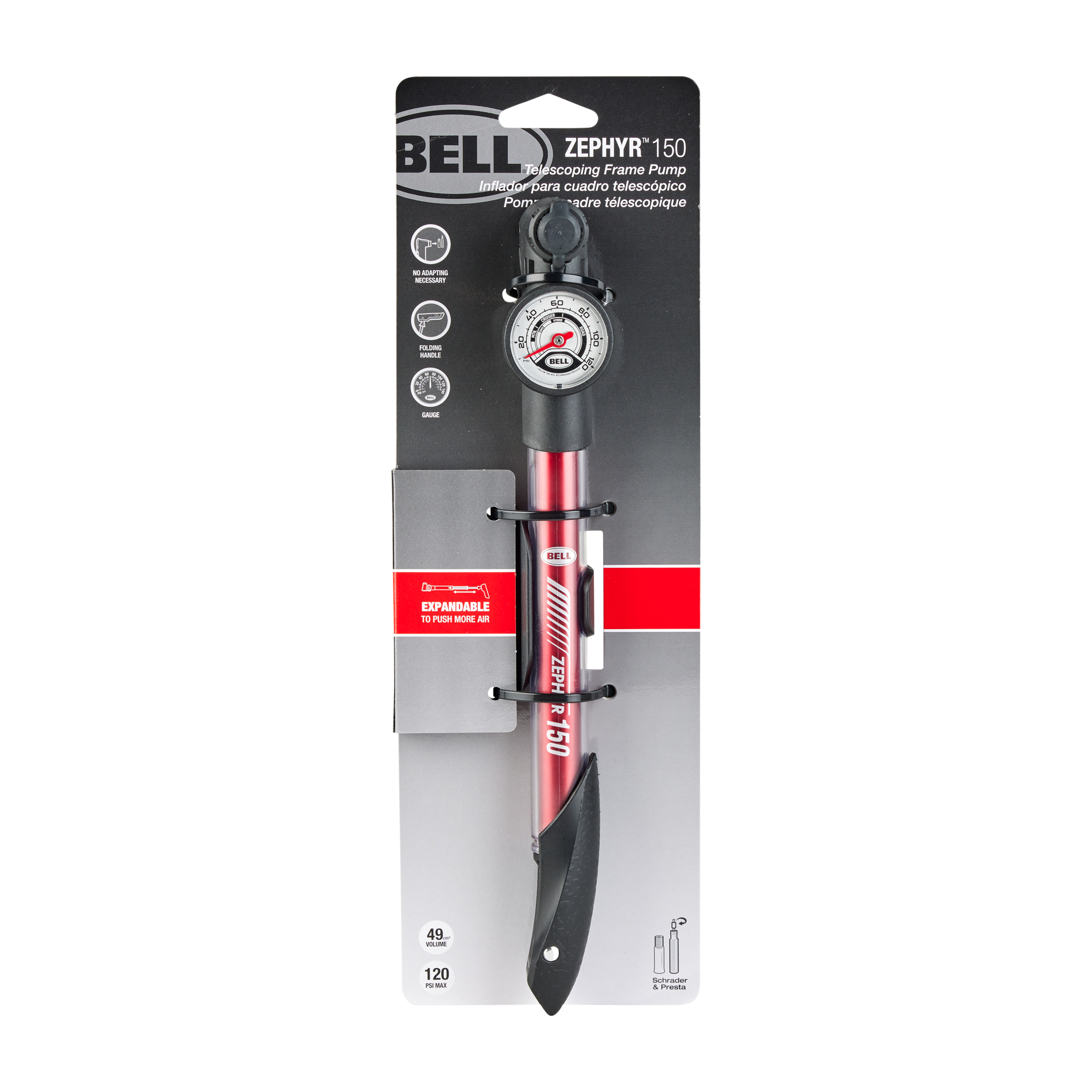 Bell's Zephyr frame pumps provide a quick, easy solution for inflating your tires or fixing a flat on theroad or trail. Their small size and light weight make them easy to mount to your bike frame, or simply carry in yourbackpack or hydration pack. The Zephyr(tm) 150 features a telescoping handle with Smart Valve pump head that autoadjusts to Schrader and Presta valves. This model has a large, easy-read gauge for accurate inflation and a pivotingT-handle for sure grip. The included mounting bracket allows you to store the pump conveniently on your bike frame.The Zephyr(tm) 150 inflates bike tires up to 120 PSI with a barrel volume of 49 cm3.Specifications