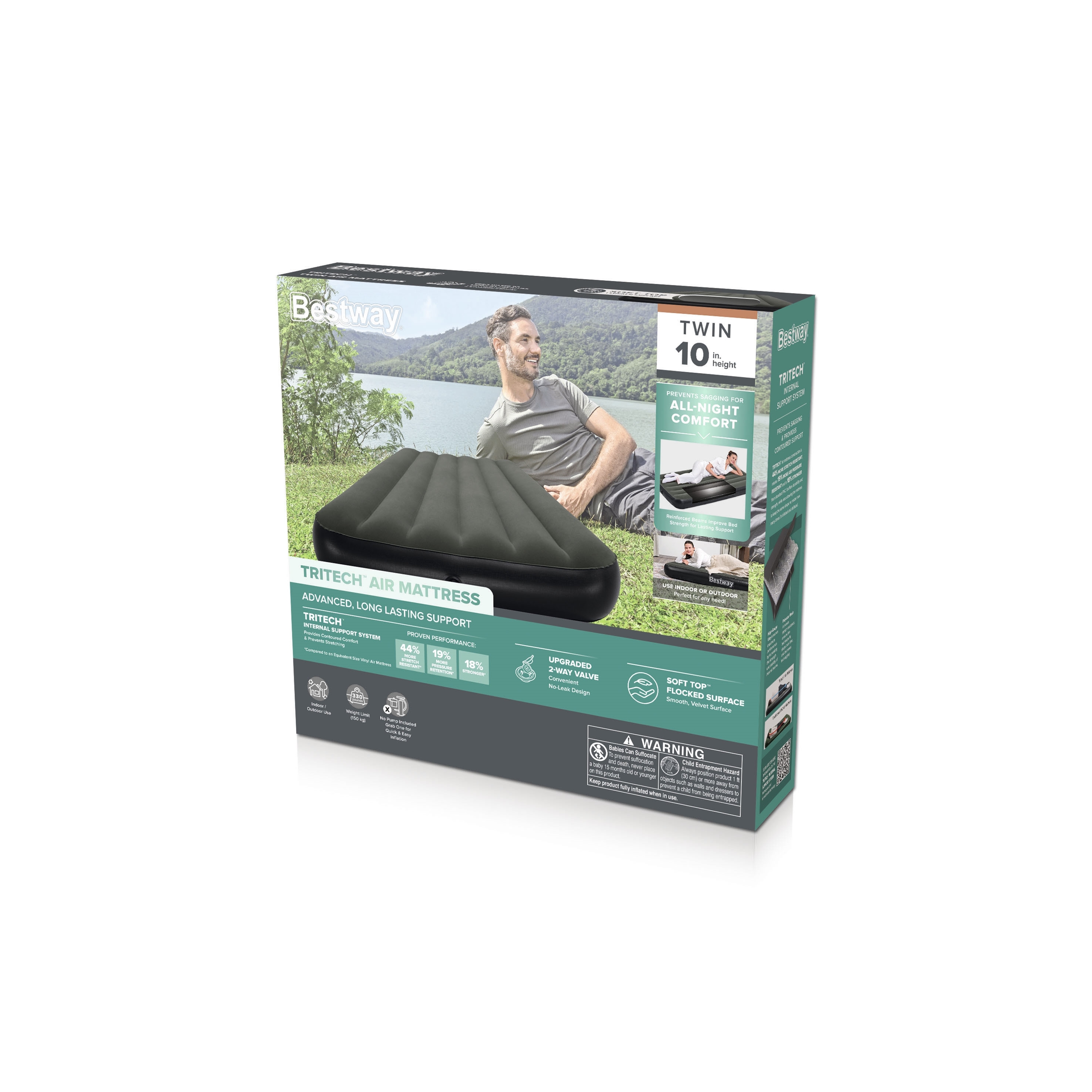 Designed for indoor and outdoor use. Bed height: 10 in. / 25 cm. Tritech Internal Support System is 44% more stretch resistant, retains 19% more pressure and is. 18% stronger than PVC. Contoured vertical I-beam construction. Comfortable flocked sleeping surface. 2-way interlocking quick release valve for fast, easy inflation & deflation. Contents: 1 air mattress, repair patchSpecifications