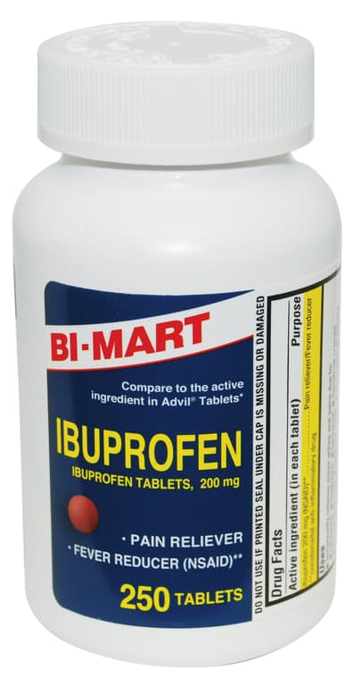 Bi-Mart Ibuprofen temporarily relieves minor aches and pains due to: backache, headache, menstrual cramps, minor pain of arthritis, muscular aches, the common cold and toothache. It temporarily reduces pain and feveSpecifications