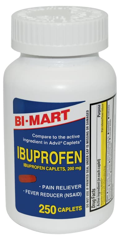 Bi-Mart Ibuprofen temporarily relieves minor aches and pains due to: backache, headache, menstrual cramps, minor pain of arthritis, muscular aches, the common cold and toothache. It temporarily reduces pain and feveSpecifications