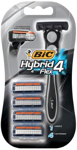 Each package of BIC Hybrid 4 Flex Disposable Razors comes with a handle and four cartridges. The razor features four flexible blades that individually adjust to the contours of the skin, providing a smoother and closer shave. BIC Hybrid 4 Flex also features a weighted handle for greater shave control and a lubricating strip and pivoting head that provides better glide.Specifications