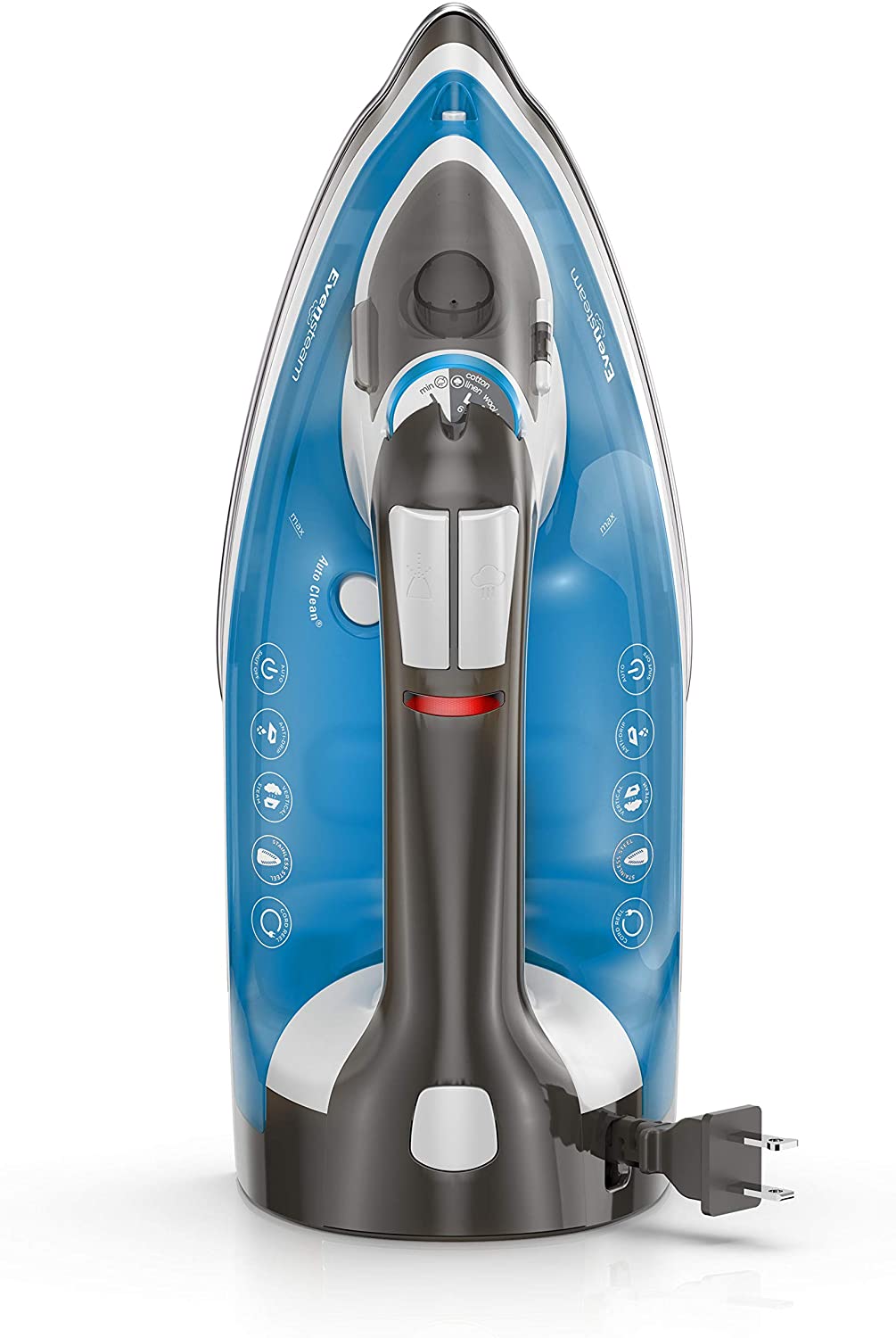 3 way safesty shut off, comfort grip; auto clean; easy fill large capacity water tank; ergonomic; pro steaming results; stainless steel soleplate for durability